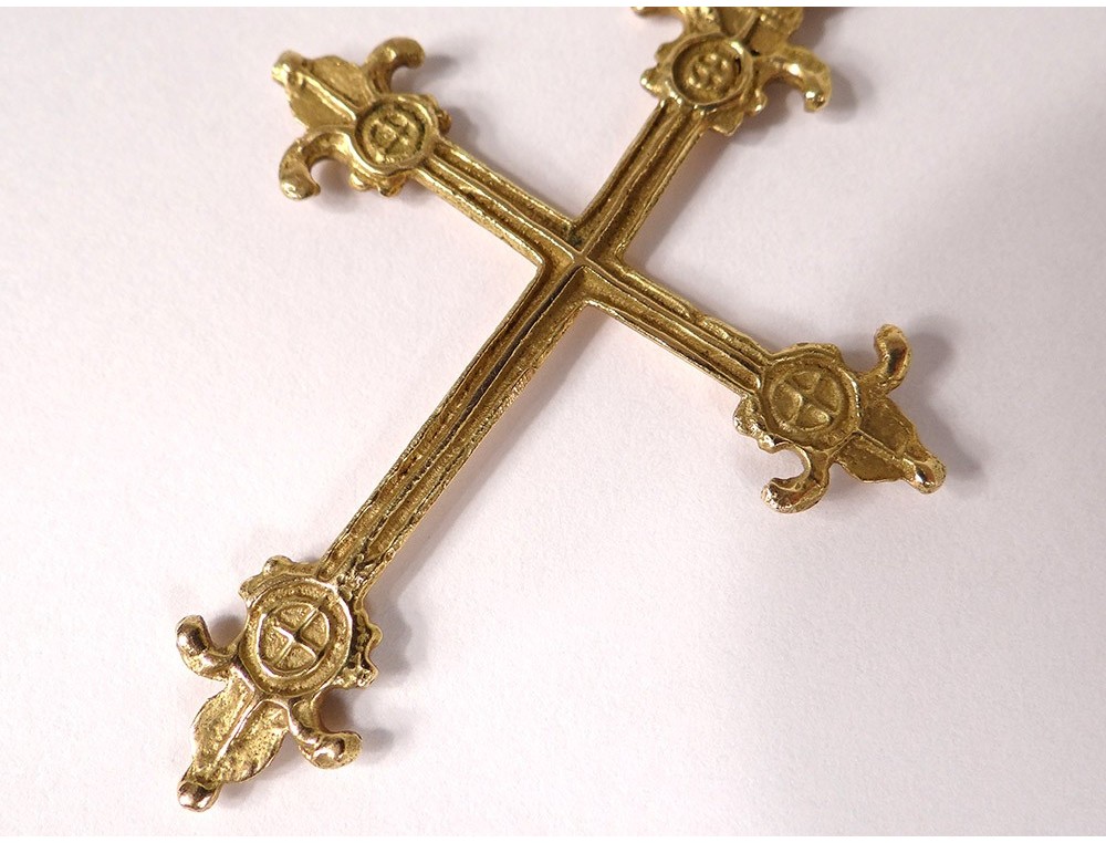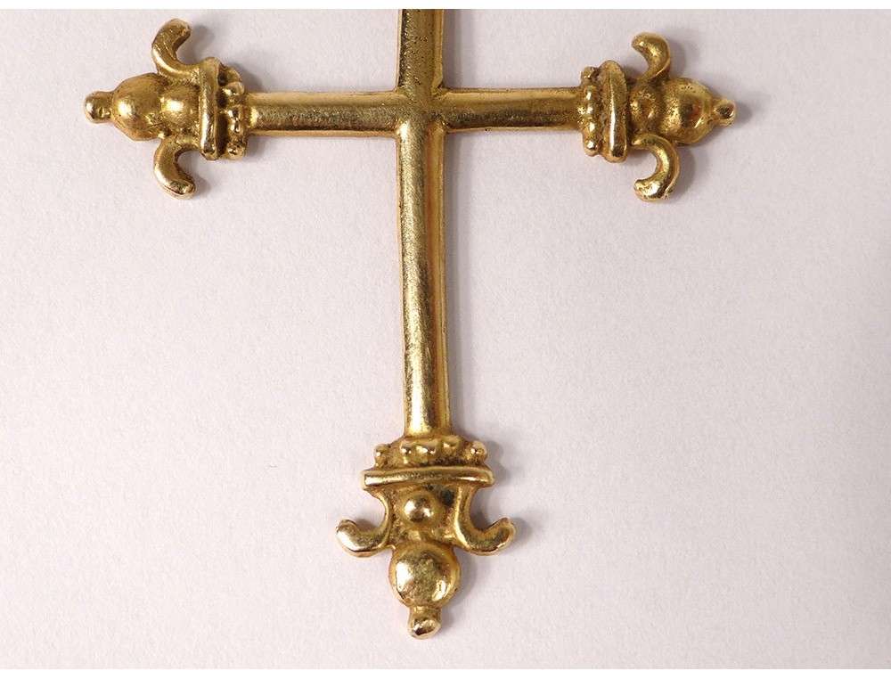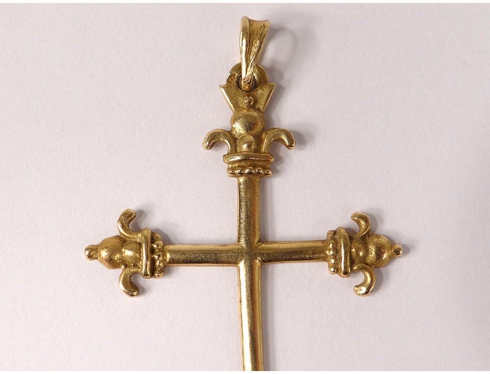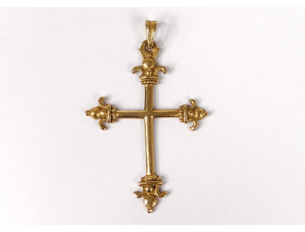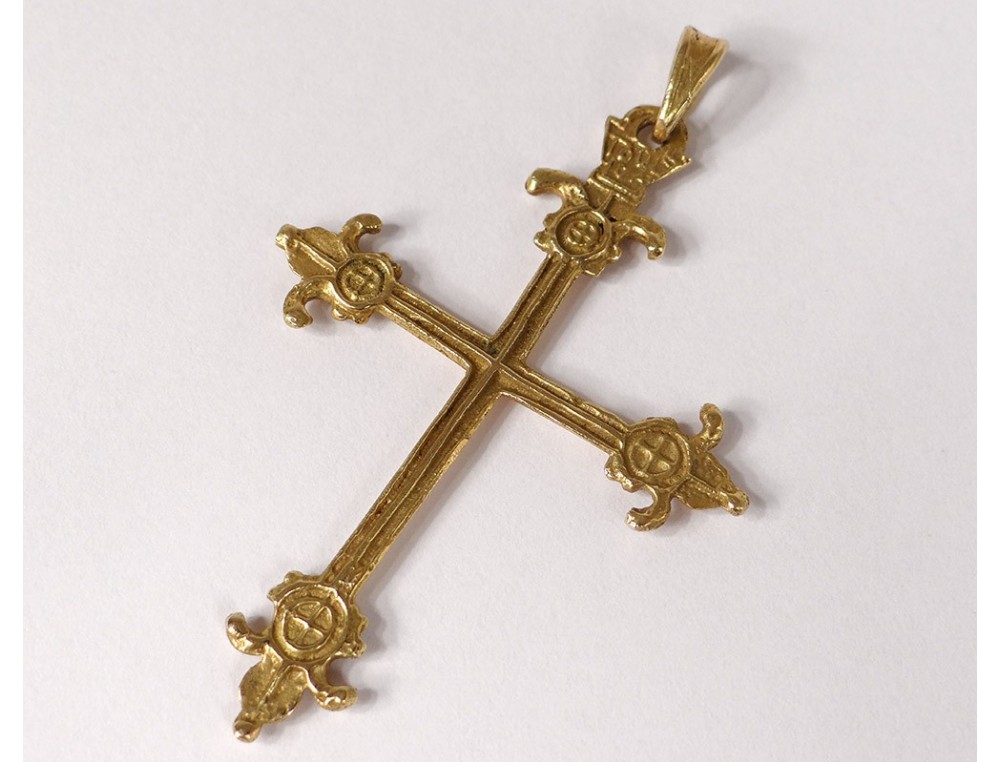 Cross pendant in 18 carat solid gold (eagle head punch) decorated with fleur-de-lis, signed by the Breton silversmith Pierre Toulhoat *, vintage twentieth century.