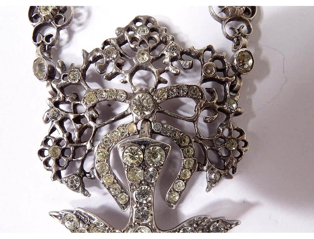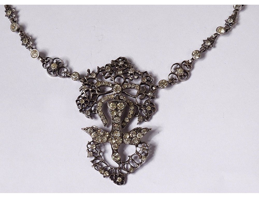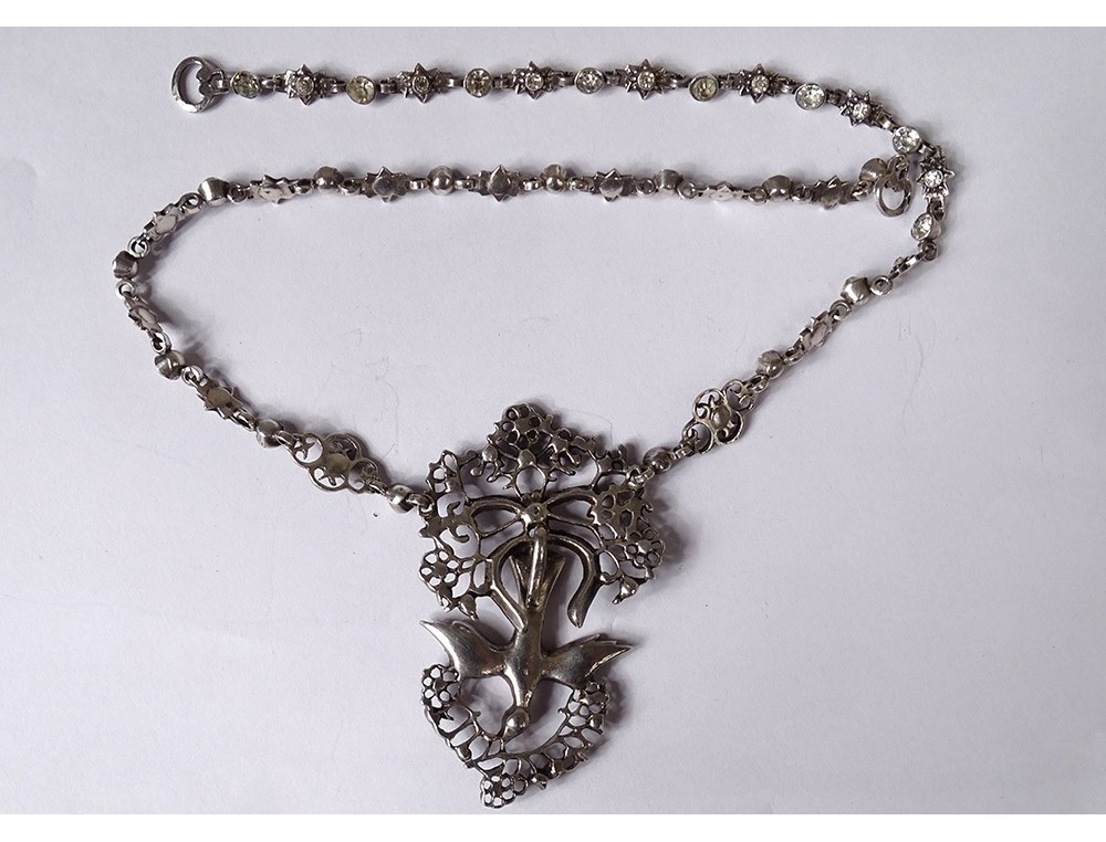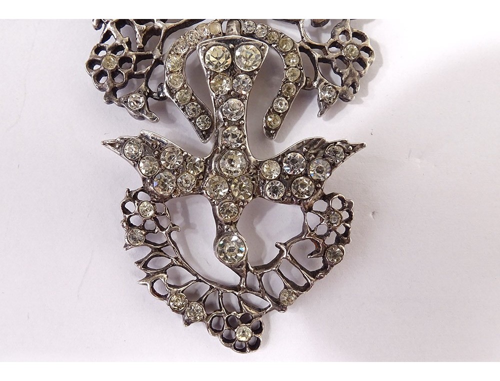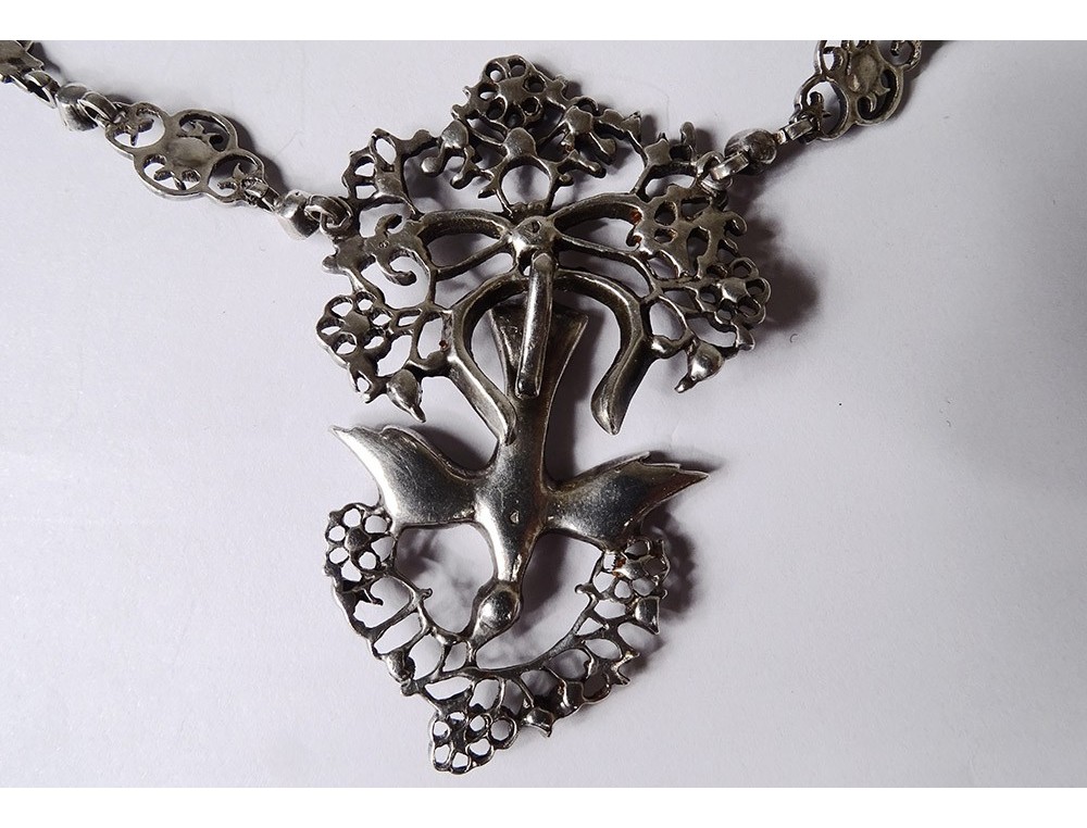 Necklace said "Holy Spirit" in finely chiseled sterling silver (wild boar head hallmark) embellished with Rhinestones, representing a dove holding a wreath around its head, surmounted by a knot, Norman work, 19th century century.