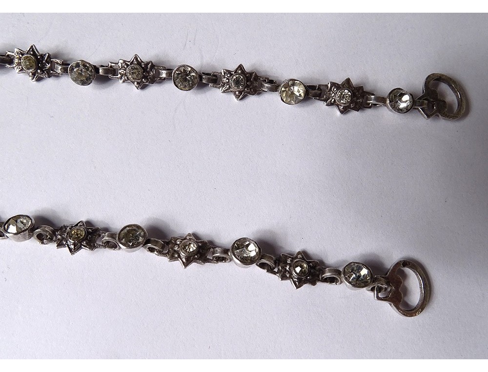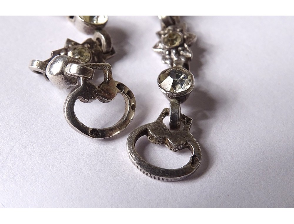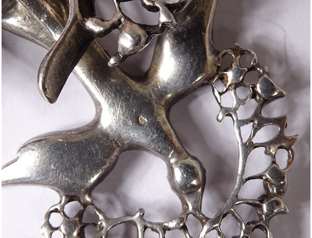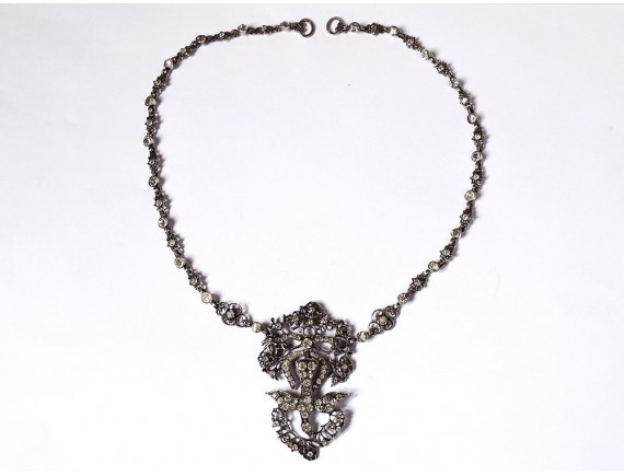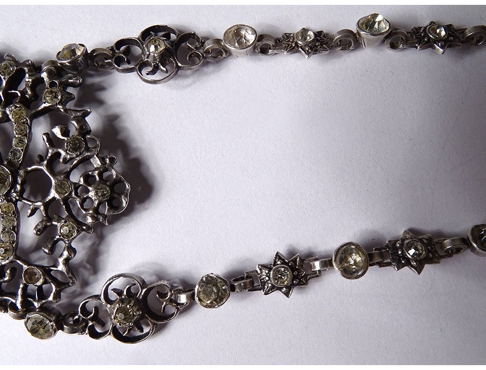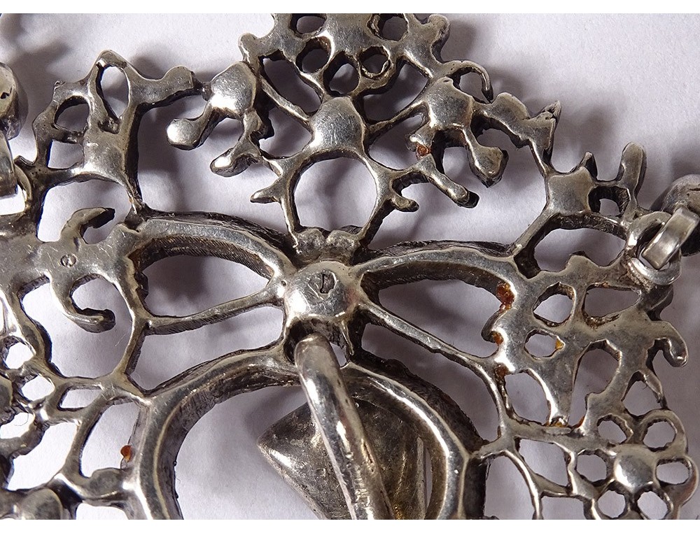 Necklace said "Holy Spirit" in finely chiseled sterling silver (wild boar head hallmark) embellished with Rhinestones, representing a dove holding a wreath around its head, surmounted by a knot, Norman work, 19th century century.