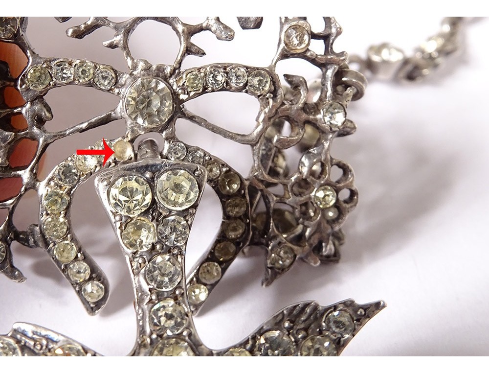 A note: missing the clasp, missing a small stone (see red arrow), micro-scratches and slight wear of time, see photos.