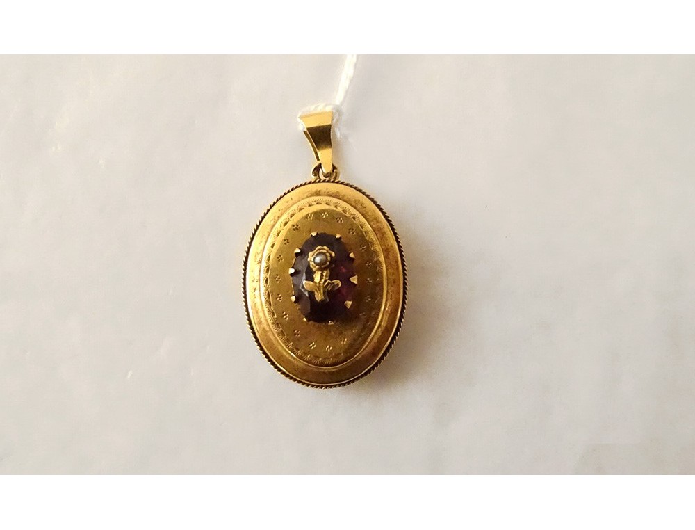 Pendant forming a reliquary or photo holder in solid 18 carat gold (eagle's head hallmark), adorned with an amethyst itself decorated with a small flower, from the 19th century.