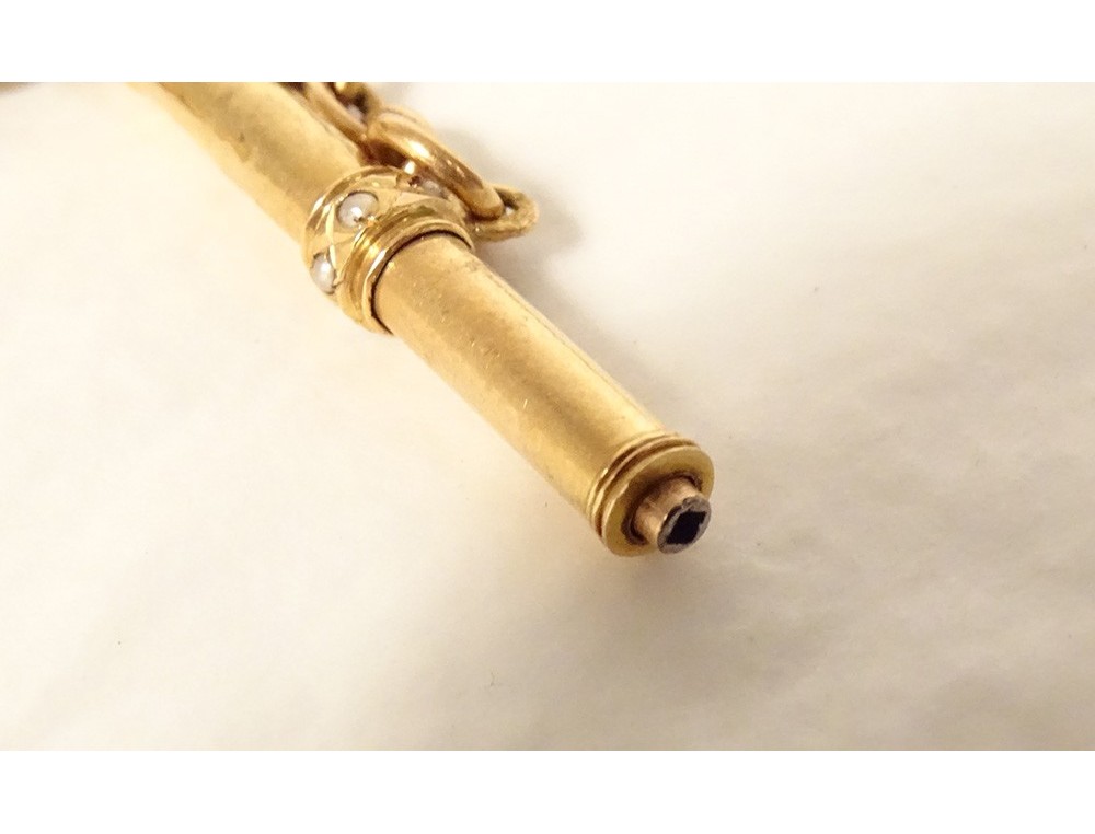 18K solid gold watch chain, eagle head hallmark, with its 18K gold watch key decorated with small pearls. Gross weight 17.10 grams.