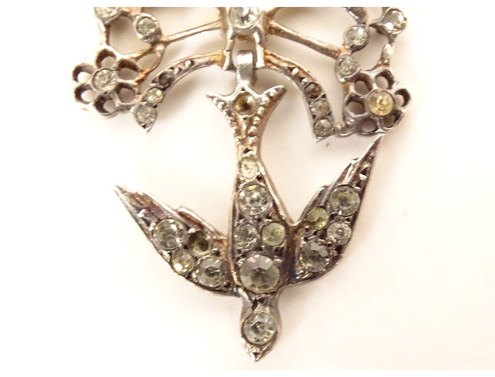 Pendant known as "Holy Spirit" in solid silver (boar's head hallmark) adorned with small Rhine stones, formed of a ribbon knot holding a dove on a background of branches, Norman work, 19th century period.