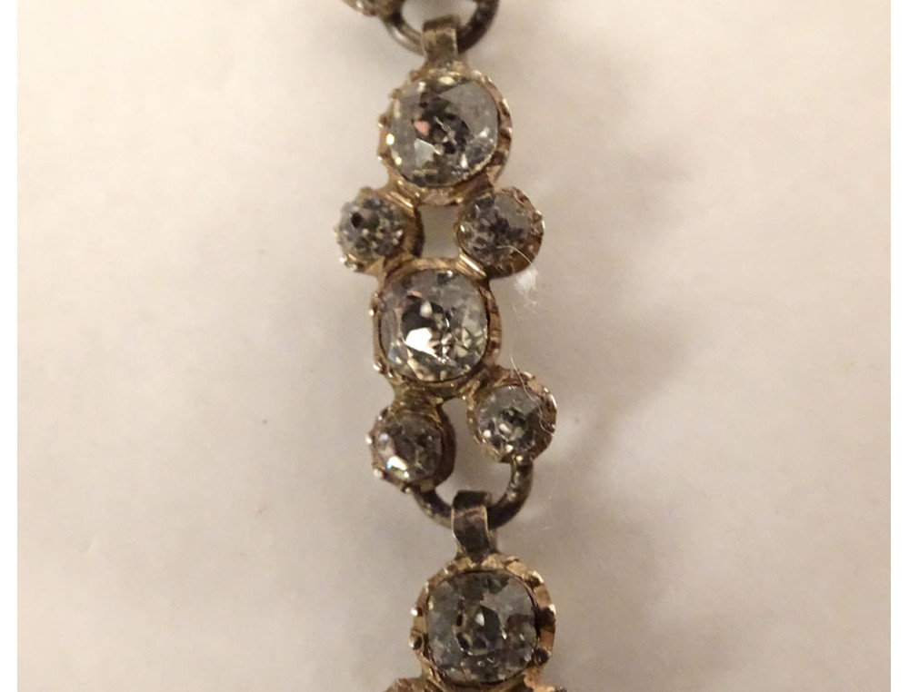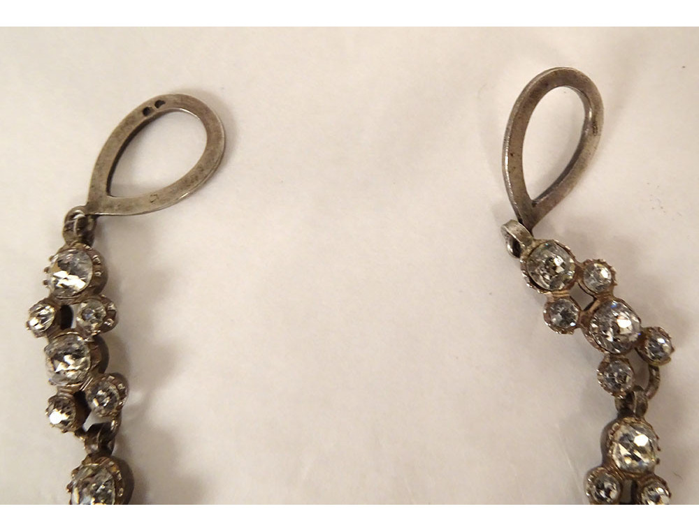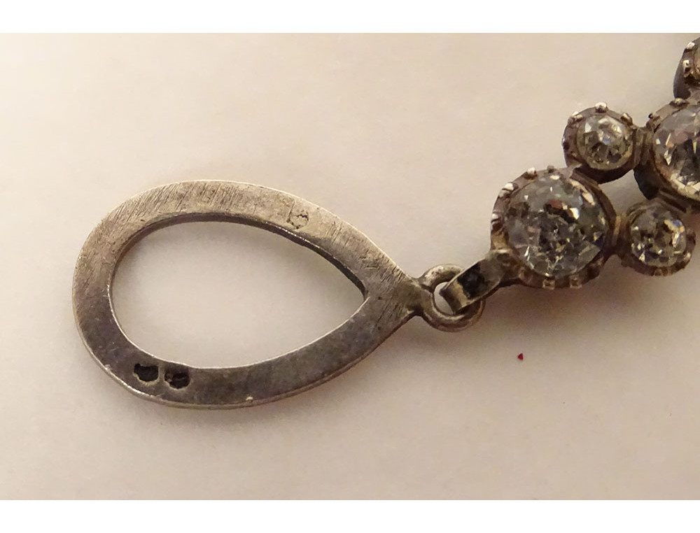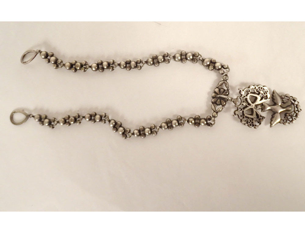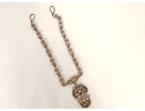 Necklace known as "Holy Spirit", pendant and necklace in finely chiseled solid silver (boar's head hallmark) set with Rhine stones, representing a dove holding a sheaf of flowers around its head, surmounted by a knot, Norman work, 19th century period.