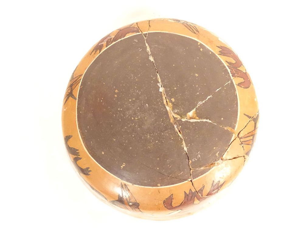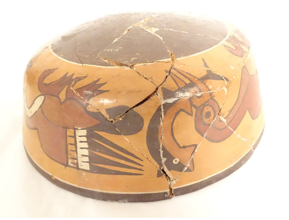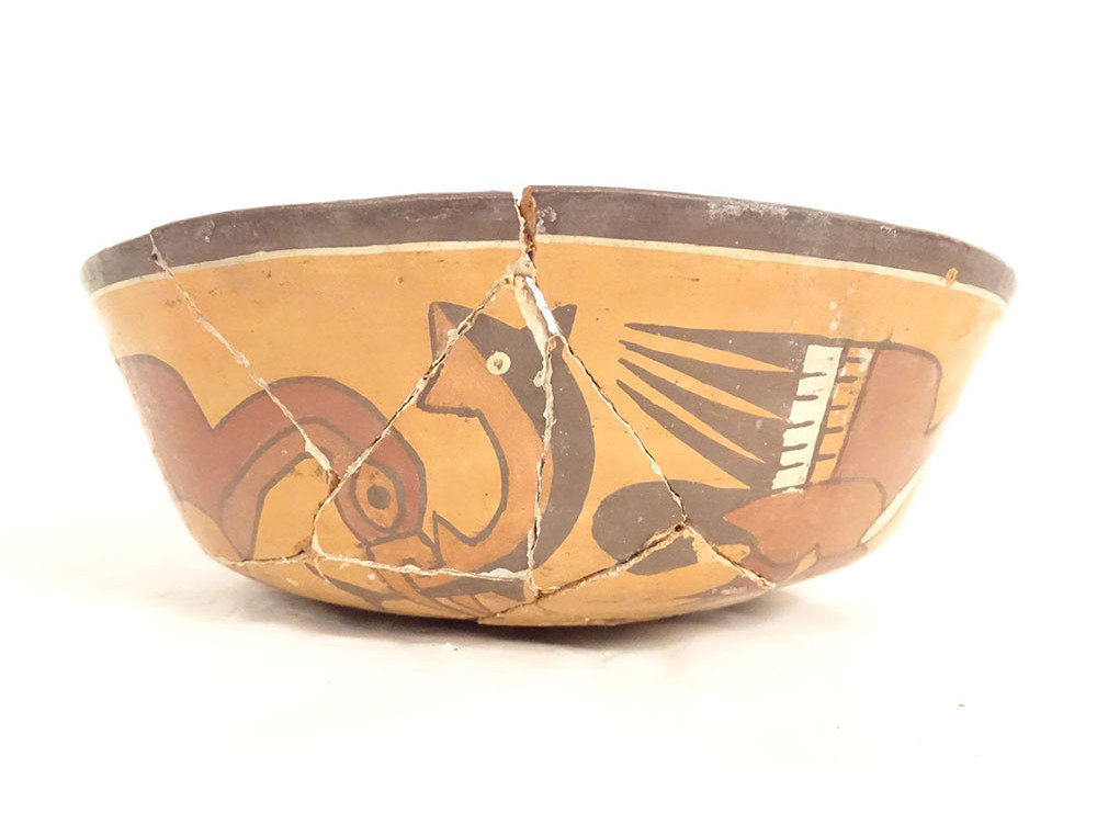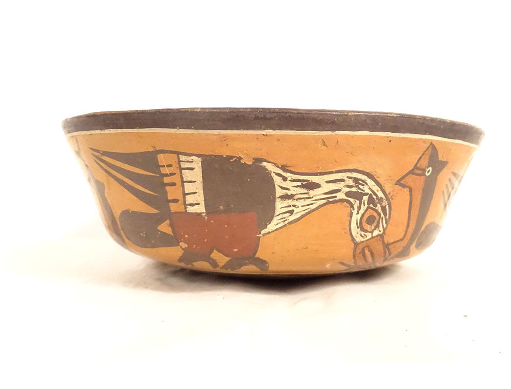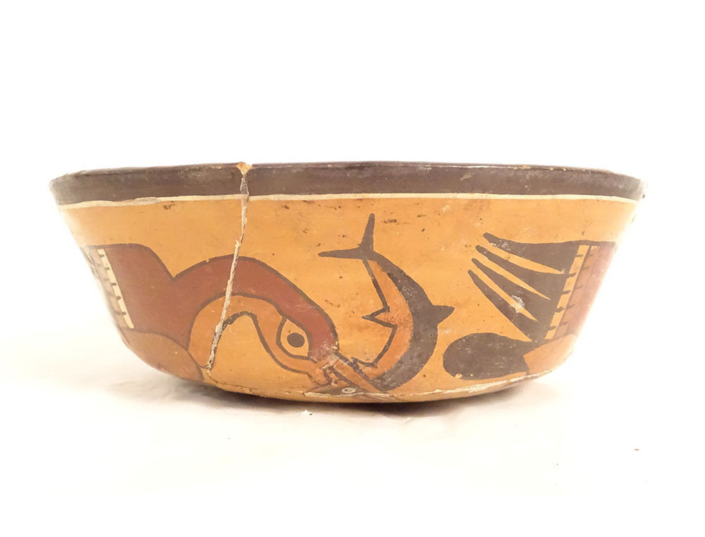 Pre-Columbian Nazca bowl from Peru, featuring birds and fish, polychrome terracotta.