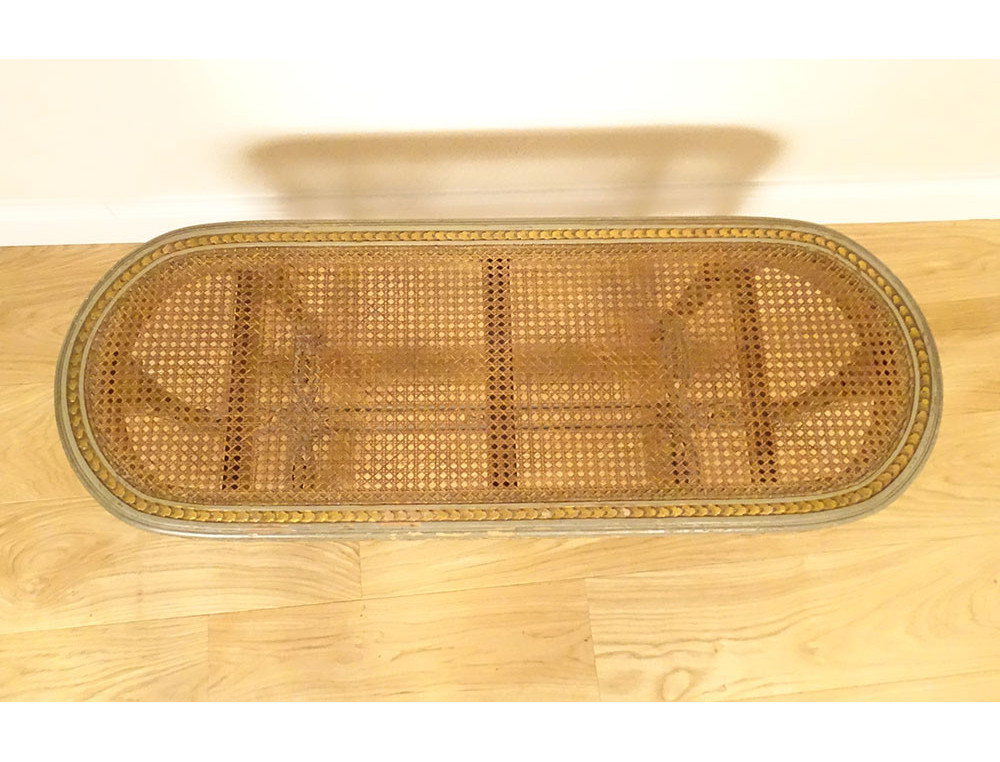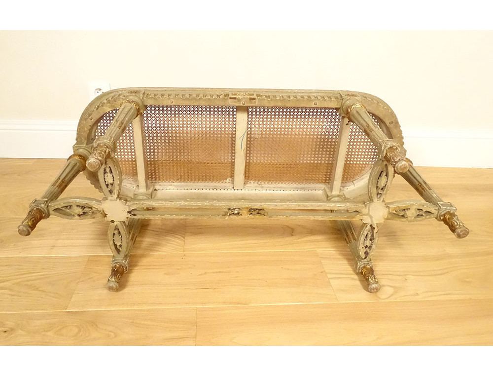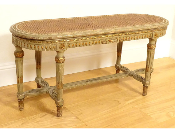 Louis XVI style piano bench in carved, lacquered and gilded wood, belt with ribbons and small flowers, tapered and fluted legs joined by a spacer with interlacing patterns, caned top, Napoleon III period, 19th century.