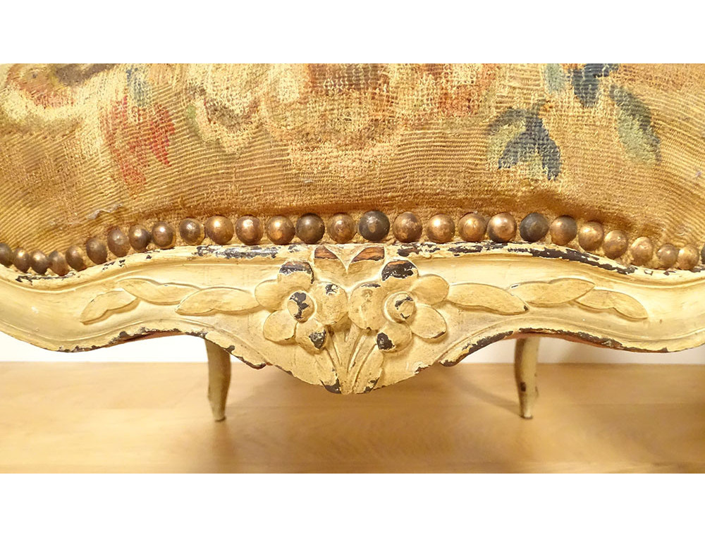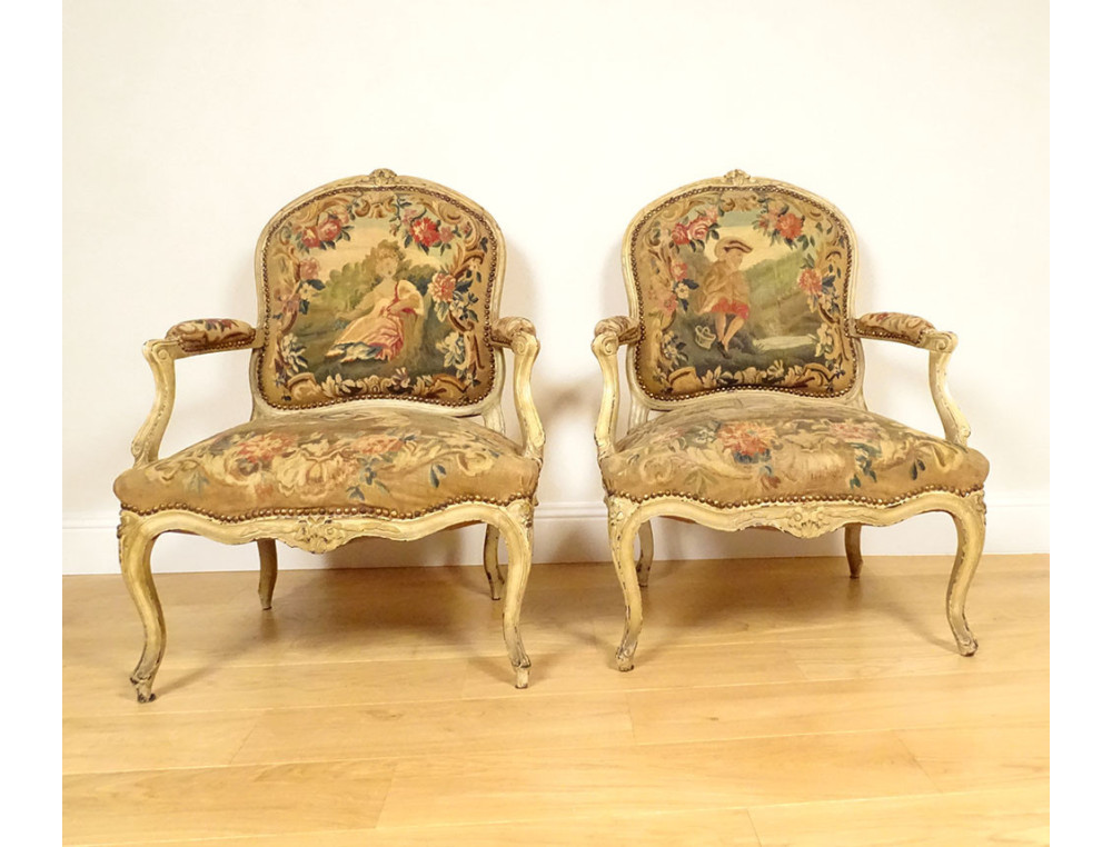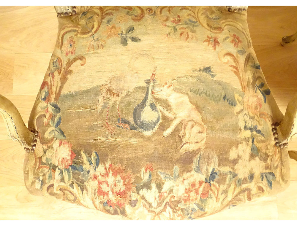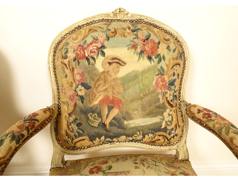 Pair of Louis XV armchairs à la reine* in carved lacquered wood, with wide backs and whiplash armrest supports, curved legs with flowers, Aubusson tapestry upholstery: backs presenting a gallant scene with a gentleman for one and an elegant woman for the other, seats decorated with Fables by La Fontaine "The Fox and the Stork" and "The English Fox", from the 18th century.