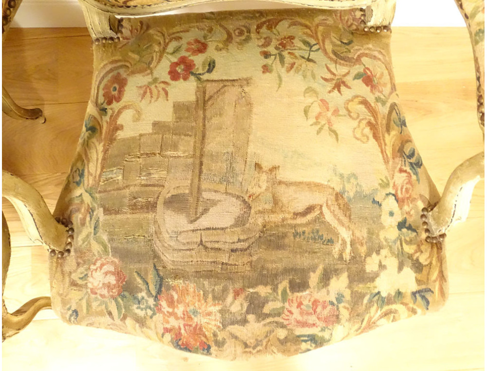 They each feature a La Fontaine fable on the seat. The armchair with the young girl illustrates "The Fox and the Stork," the latter drinking from the fox's long-necked, bearded vase. The second armchair with the young man illustrates "The English Fox," with the fox approaching a gallows.