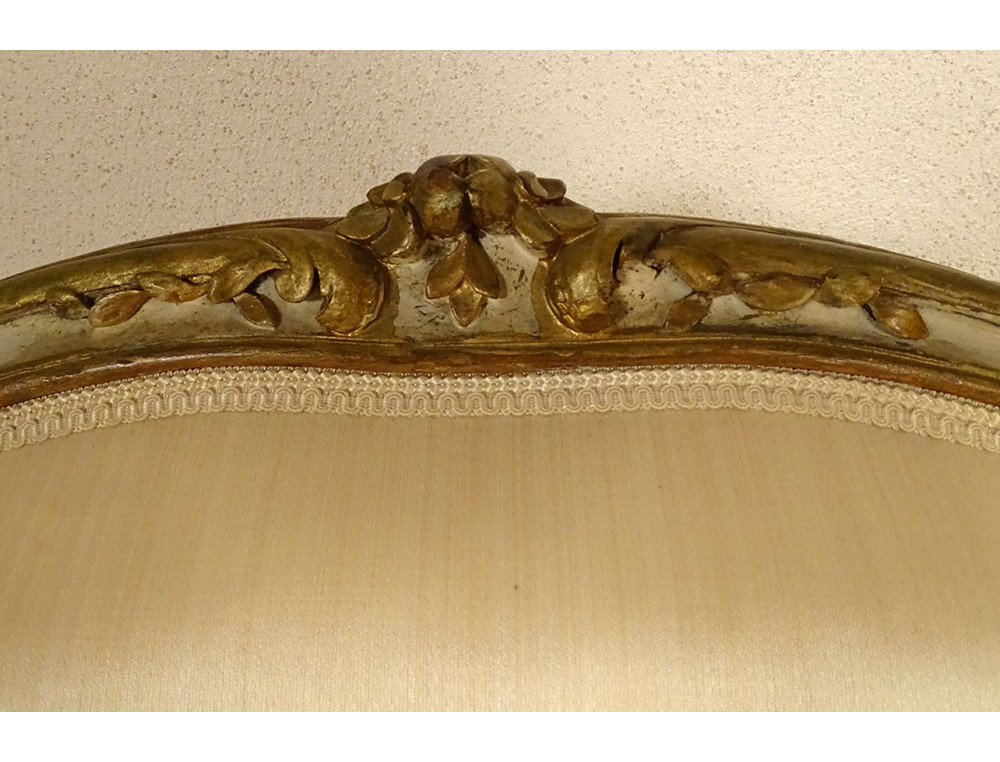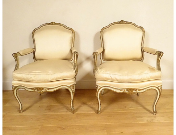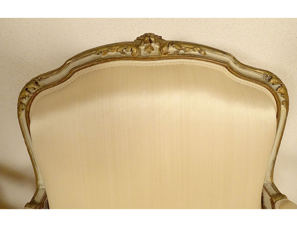 Pair of Louis XV style armchairs, known as "à la reine"*, in lacquered and gilded wood, with a wide backrest carved with small flowers and acanthus leaves, whiplash armrests, resting on four curved legs, from the 19th century.