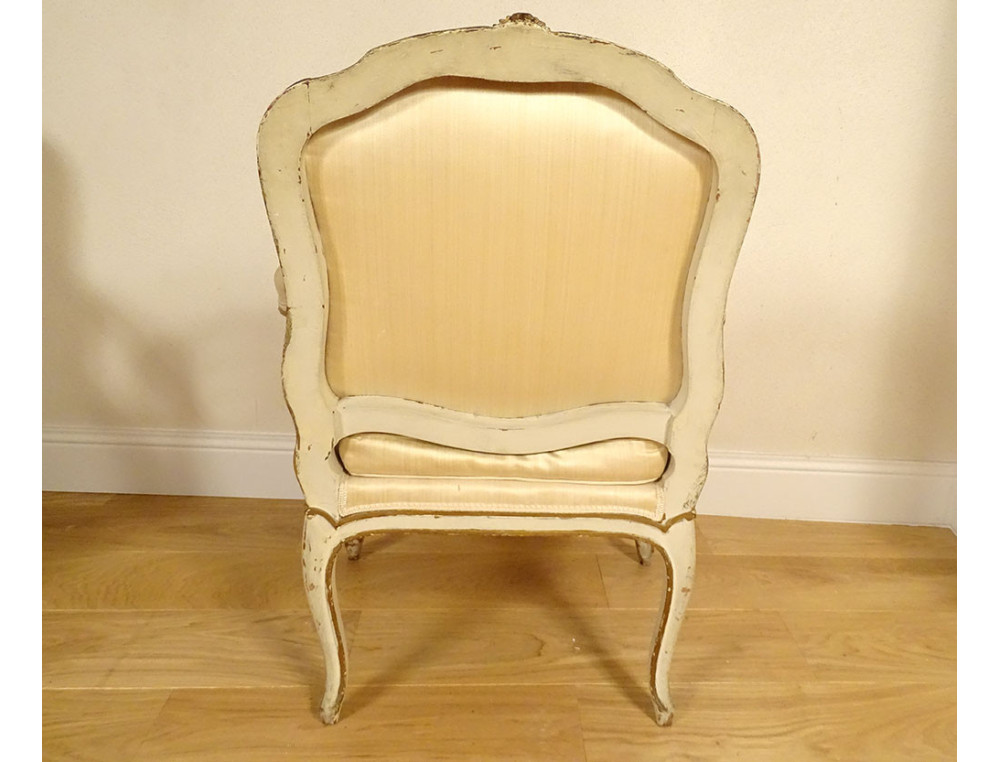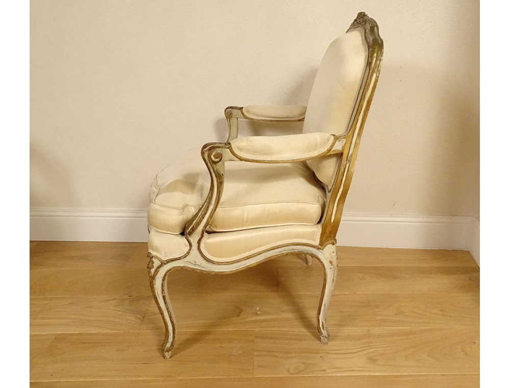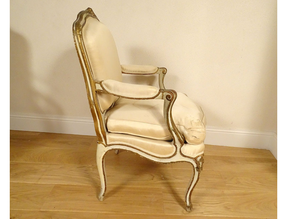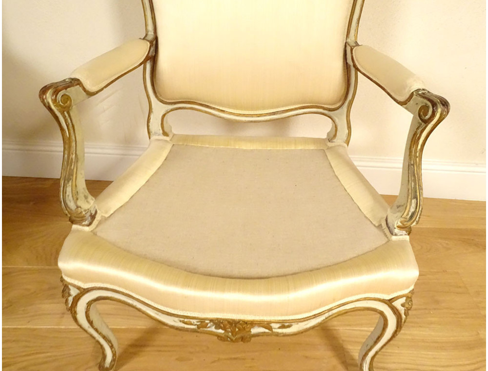 * The name "Fauteuil à la Reine" (Queen's Armchair) appeared in 1730 during the second half of the 18th century. This type of armchair was brought up to date by Queen Marie Leczinska (1703 – 1768), wife of Louis XV. The Queen's armchair is a Louis XV and Louis XVI style seat characterized by its flat back (rectangular, square, oval, violin-shaped). Manufactured until the end of the 18th century, the Queen's armchair is adorned with cartouches, shells and clasps decorated with water leaves or acanthus. This Louis XV armchair favors richly flowered tapestries, bordered with gilded or lacquered wood. The Queen's armchair is described as "furniture" because its more massive design does not predispose it to being moved. (See Antic Store website)