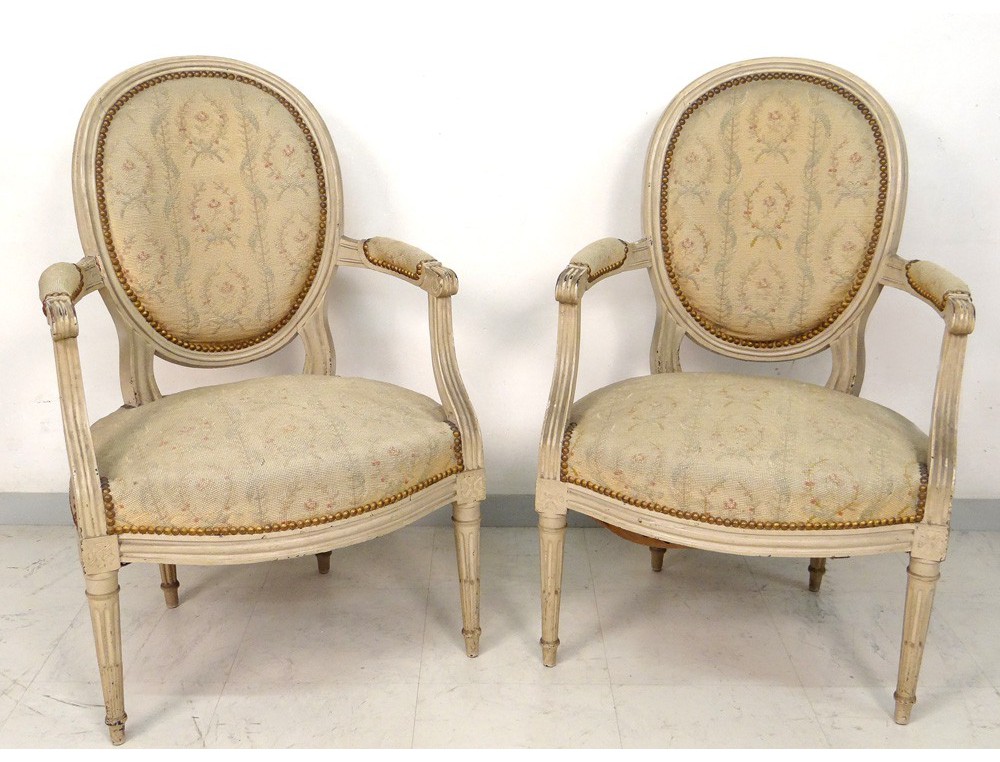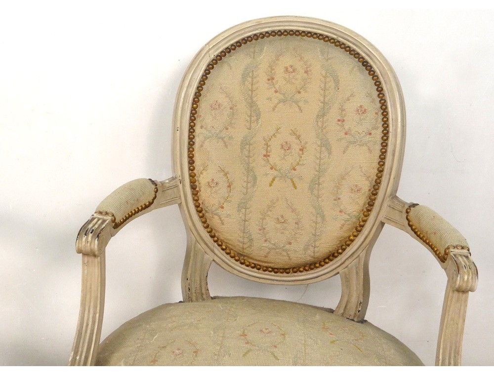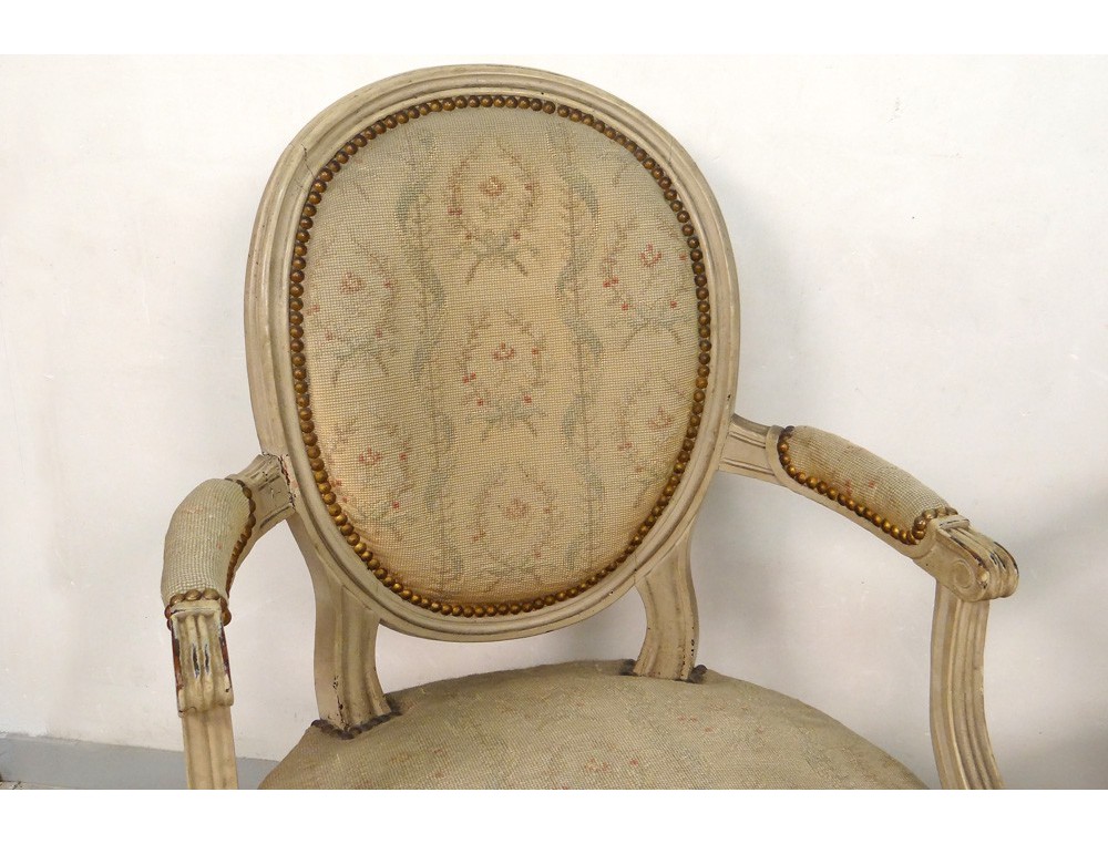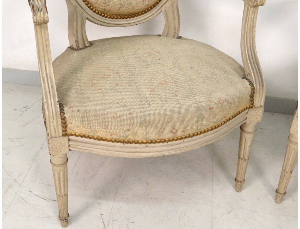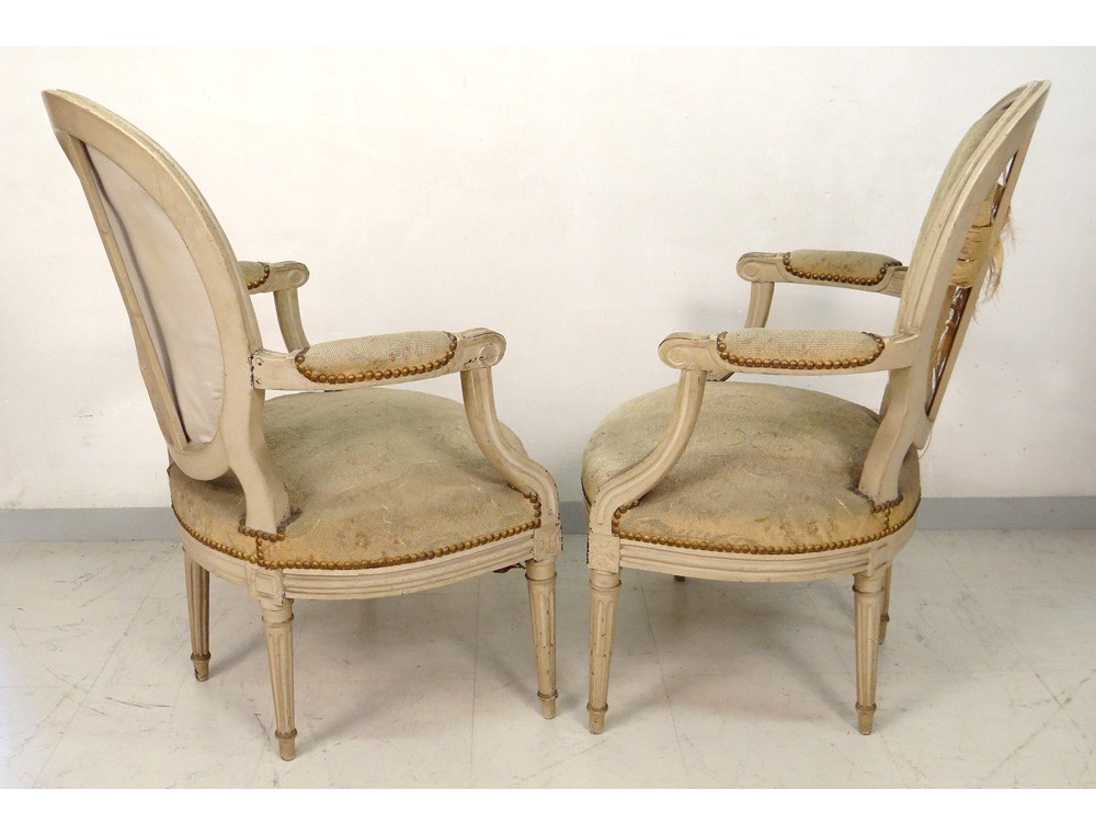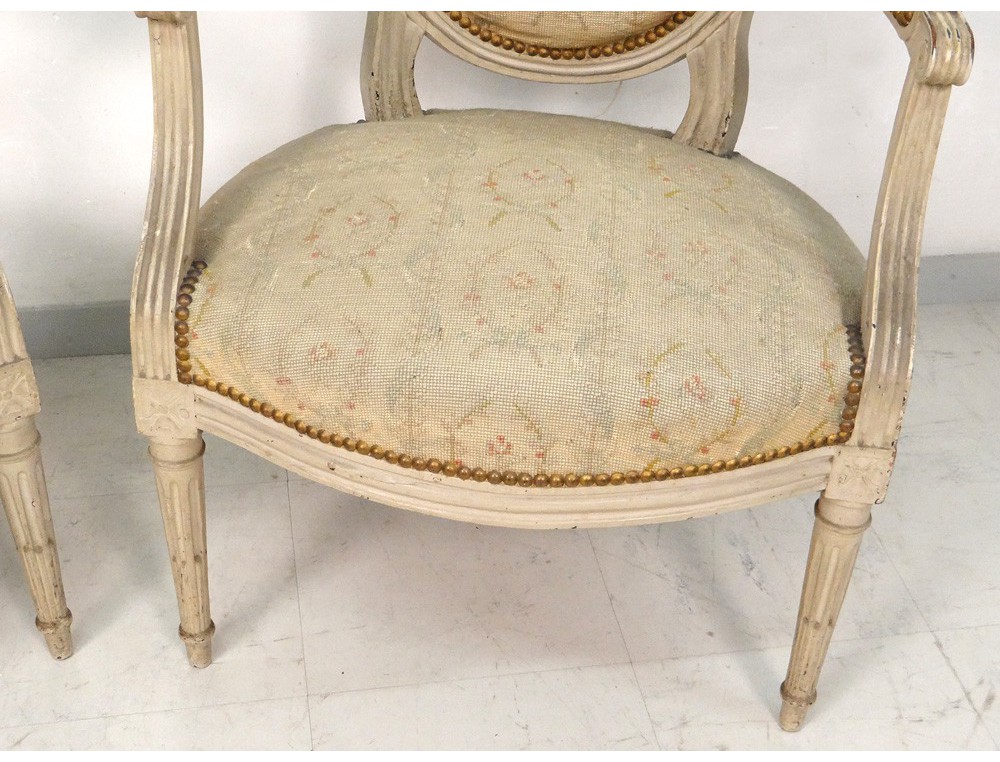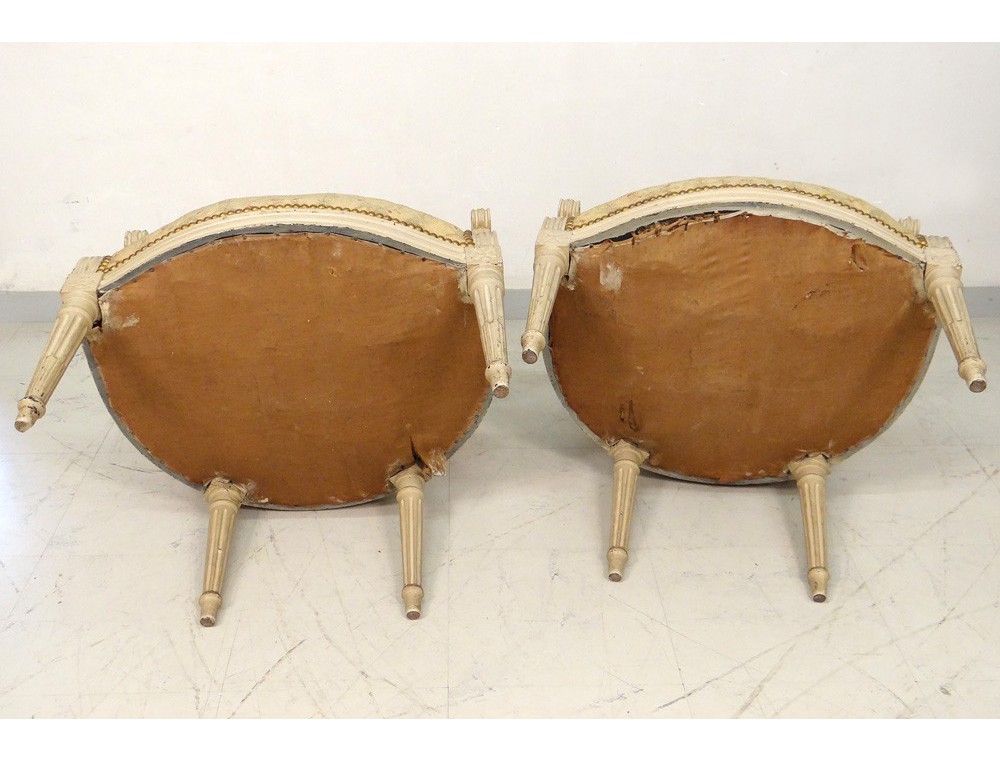 Superb pair of Louis XVI armchairs cabriolets in lacquered wood finely carved and molded medallion backrest, belt adorned with flowers, resting on four tapered legs and fluted trim tapestry dots decorated with wreaths and garlands plant, d time eighteenth century.