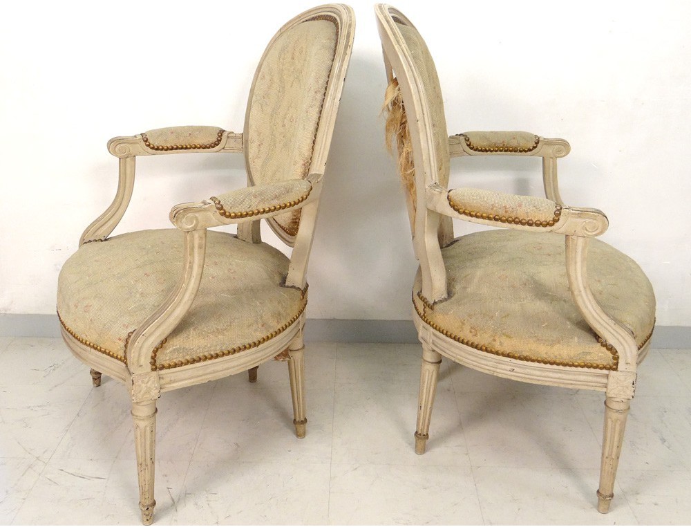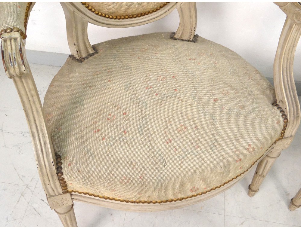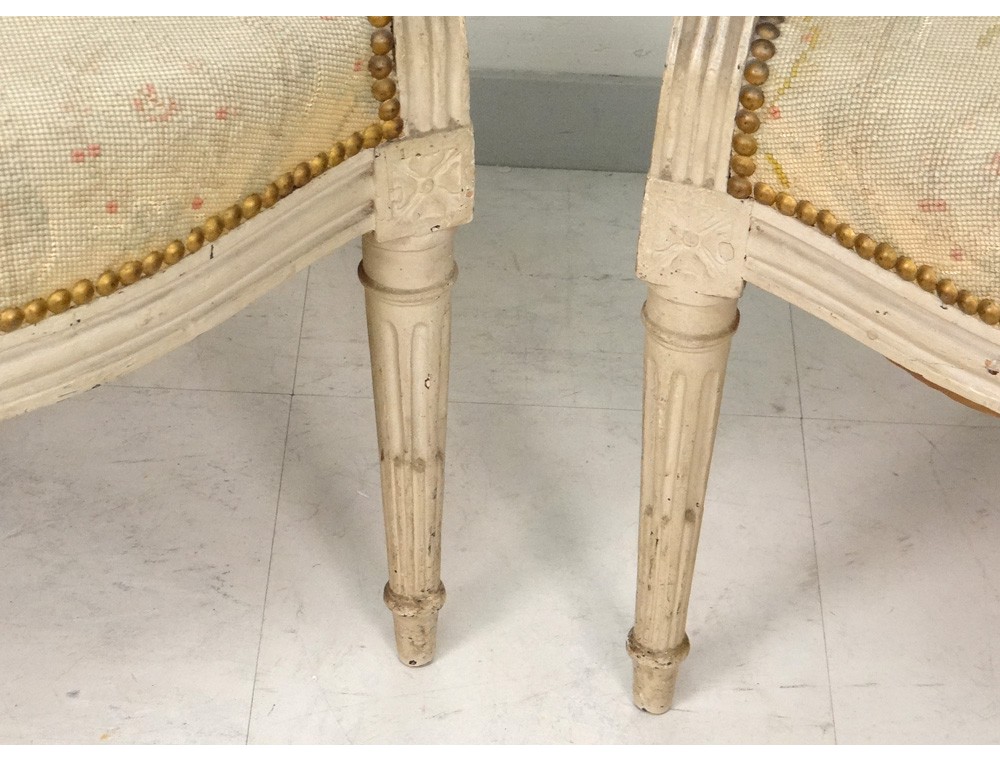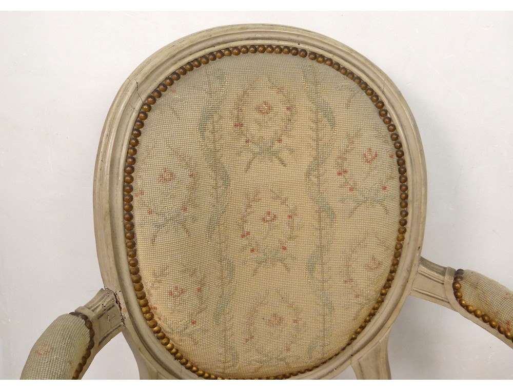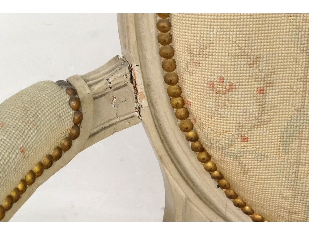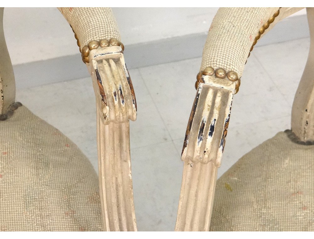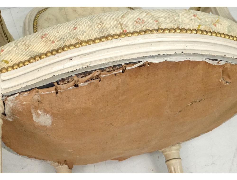 Superb pair of Louis XVI armchairs cabriolets in lacquered wood finely carved and molded medallion backrest, belt adorned with flowers, resting on four tapered legs and fluted trim tapestry dots decorated with wreaths and garlands plant, d time eighteenth century.
