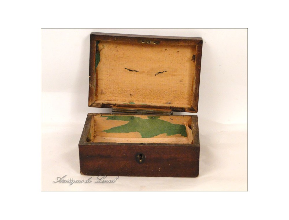 This box is in good condition. We do not have the key. A report: miss a few threads, small spots and stains on the wood in places, missing escutcheon, hinge repair will see photos.
