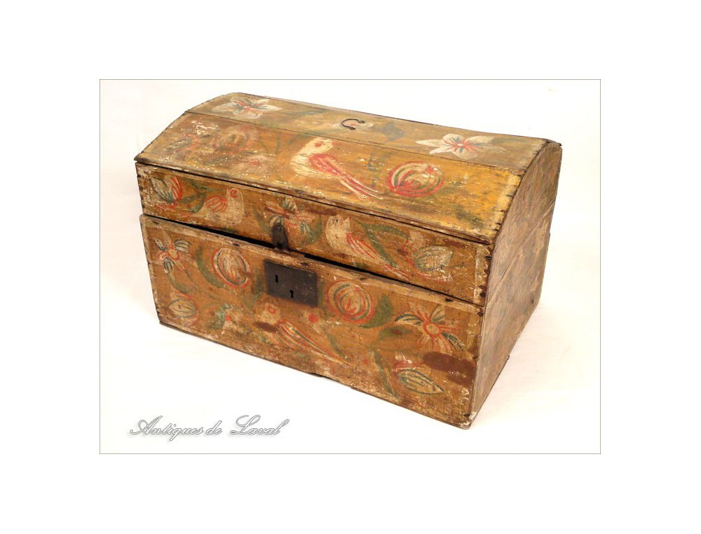 Norman wedding chest in polychrome wood, finely decorated with birds and flowers, vintage late eighteenth and early nineteenth centuries.
