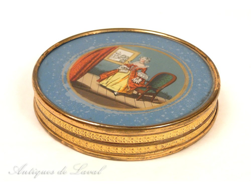 Round cardboard box gold, adorned with a set under glass on the cover depicting an elegant young woman preparing to play in a warm, vintage nineteenth century.