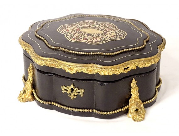 Jewelry box in blackened wood and Boulle marquetry on the lid, with threads and friezes of gilded brass beads, finely chiseled gilt bronze ornamentations in the shape of stylized shells and plant arabesques, signed Vervelle * Paris, from the Napoleon III XIXth century .
