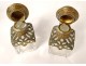Odor cellar, comprising two perfume bottles in crystal or glass and brass frame, cover adorned with two small representations of the Grand Tour (La Maison Carrée in Nîmes and the Arc de Triomphe in front of the Louvre in Paris), wooden box of rose decorated with marquetry of cubes on the top, XIXth century.