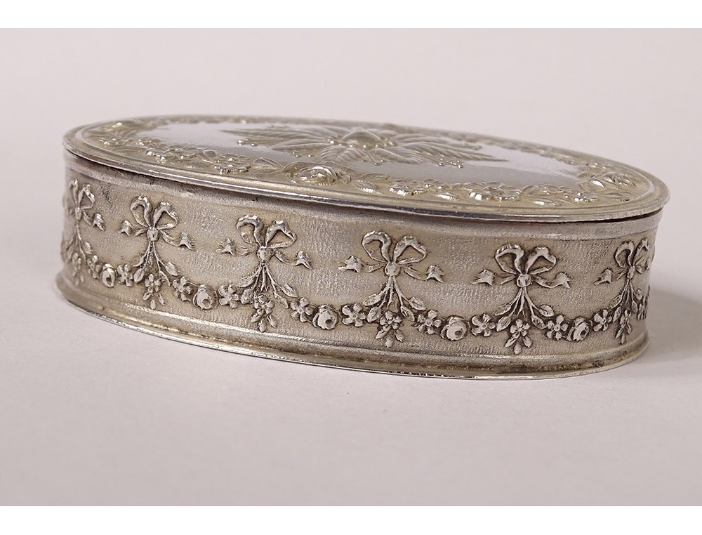 Small oval-shaped pill box, Louis XVI style, in solid silver finely chiseled with floral garlands and knots, Minerva punch and goldsmith Mon E (unidentified), vintage late 19th century.