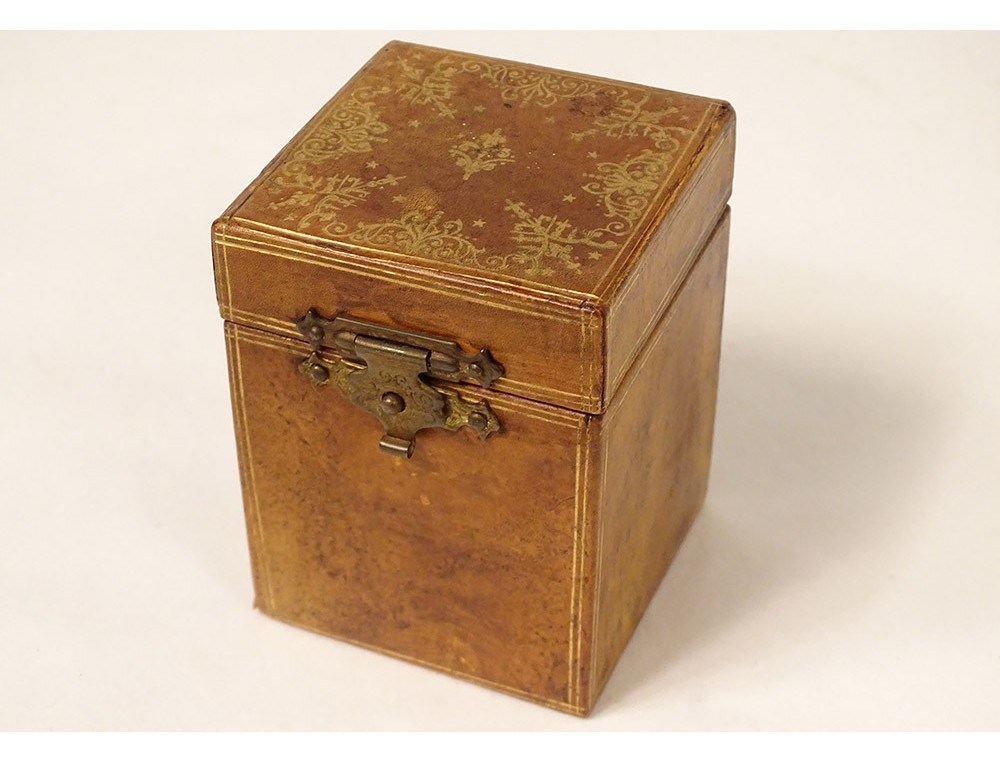 Small travel inkwell, box in embossed leather gilded with iron decorated with foliated and stylized arabesques, white porcelain container, XIXth century.