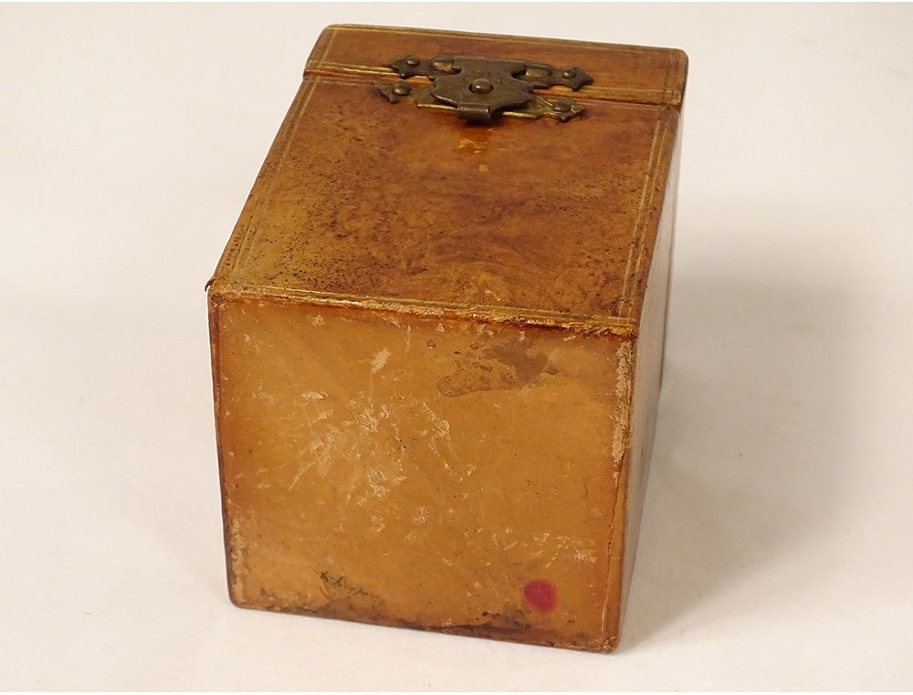 A note: cracks in the container (and small chip on the edge), wear and scratches on the leather, slight wear on the hinge, see photos.