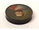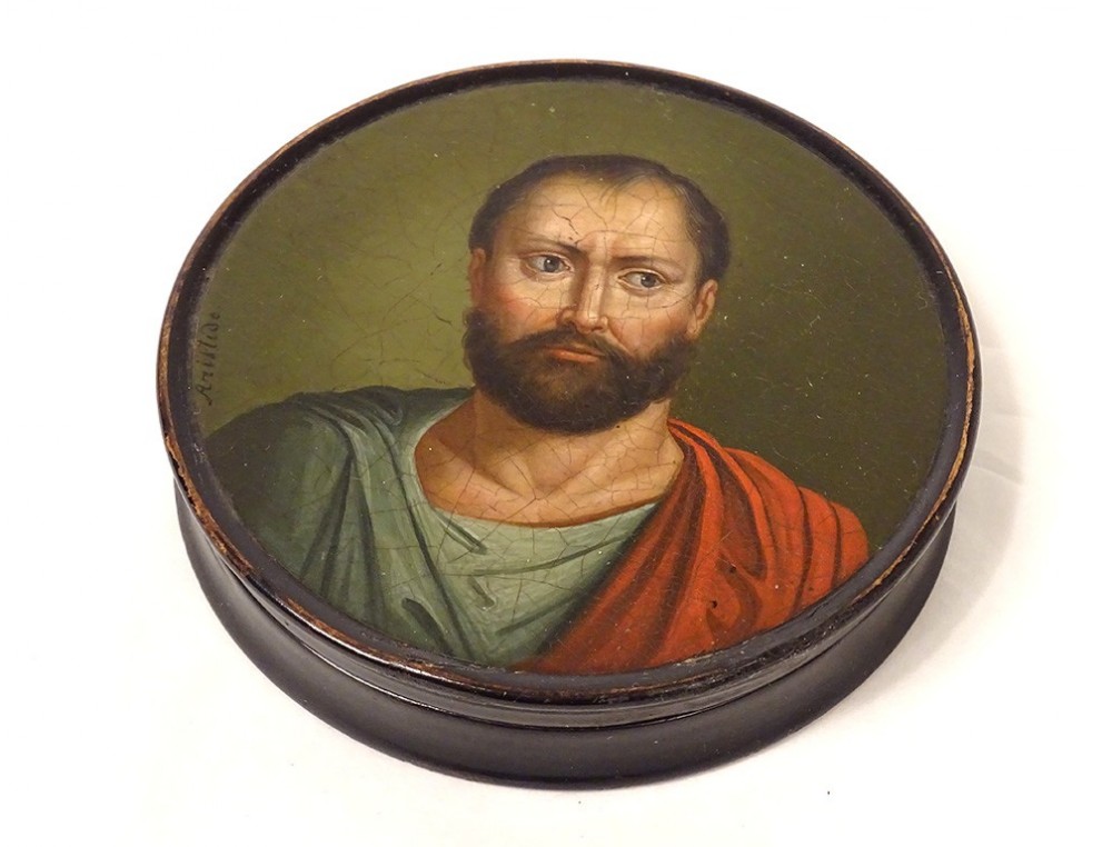 Round lacquered wood box with decoration on the lid of the portrait of a man in the antique style (perhaps a philosopher), signed Aristide, from the 19th century Napoleon III period.