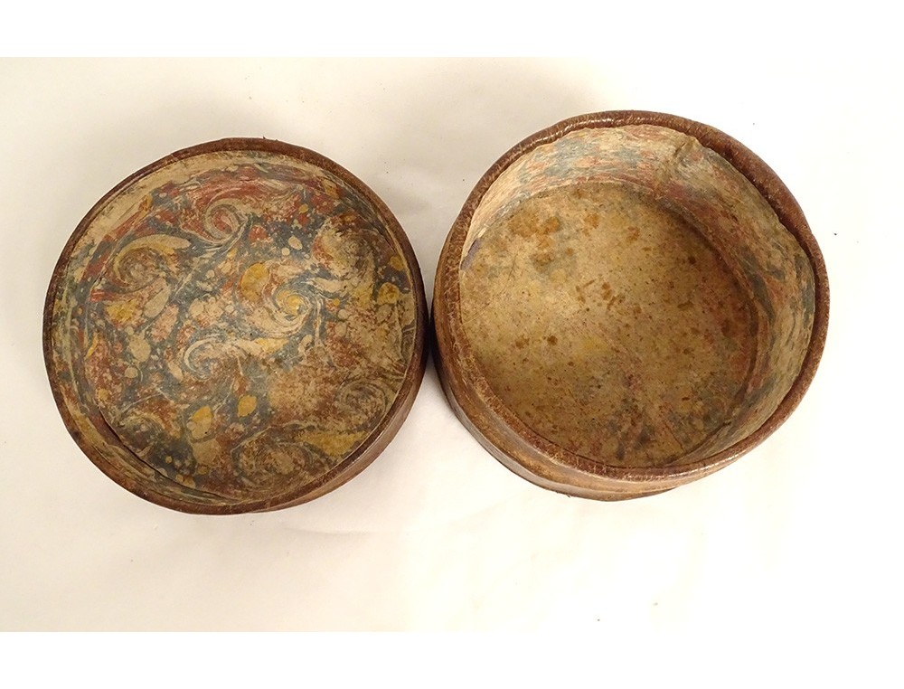 Louis XIV round box in iron-gilt embossed leather, decorated with leafy arabesque motifs, from the late 17th-early 18th century.