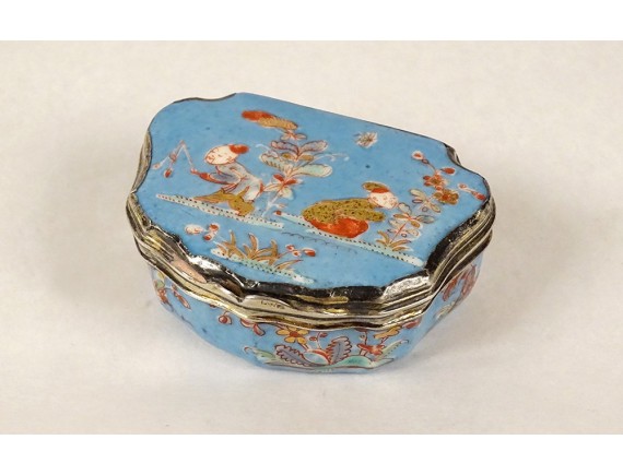 Small box with contoured edges in polychrome Saint-Cloud porcelain, with so-called Kakiémon* decoration of several Asian characters in flowery landscapes, solid silver mount (Paris 1732-1738 relief hallmark), from the 18th century.