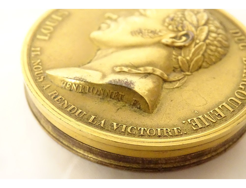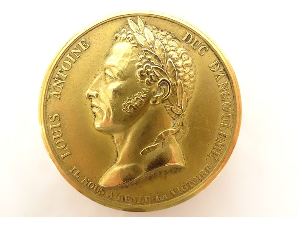 Gilded metal box medal decorated with the portrait of Louis Antoine, Duke of Angoulême, "To the Glory of the French Army 1823" on the reverse, containing 20 roundels (engravings) relating a summary of the Spanish Civil War in 1823