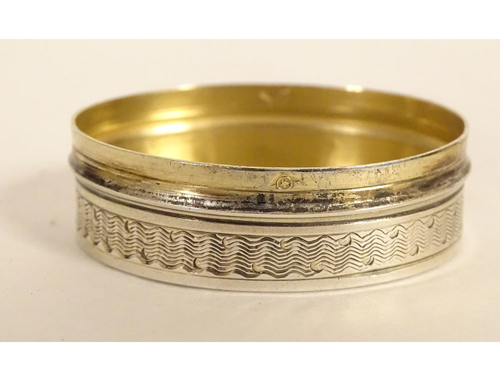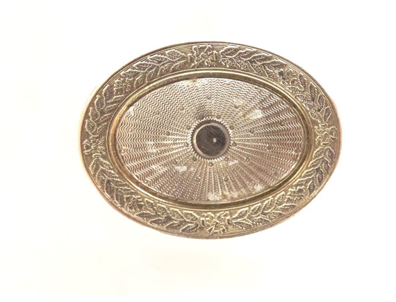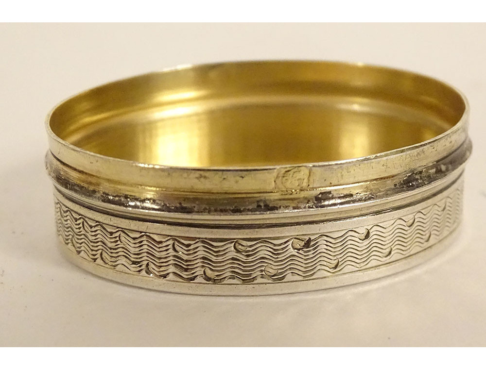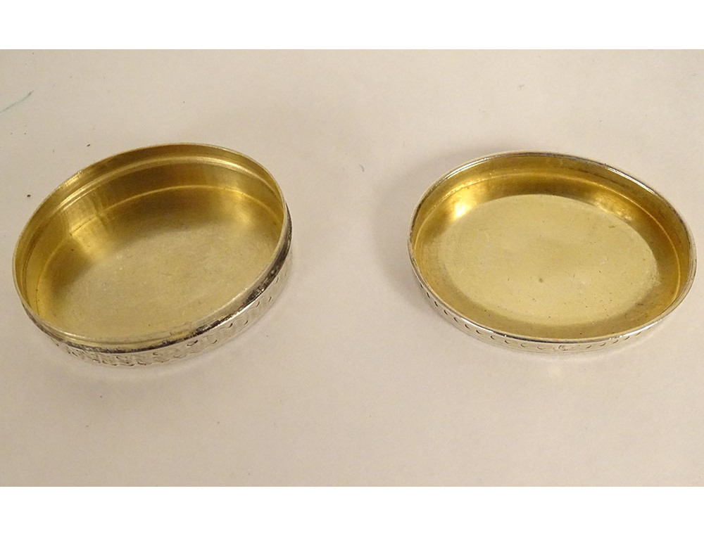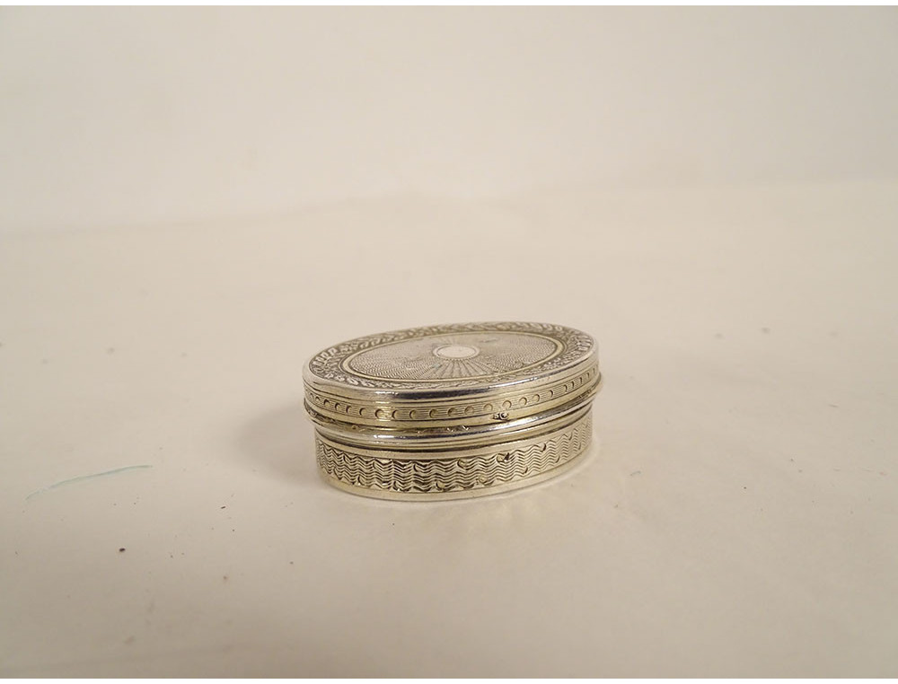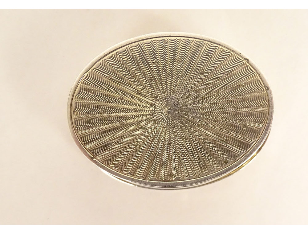 Small oval-shaped pill box in finely chiseled and guilloché silver gilt, decorated with a plant frieze around the edge of the lid, Minerva hallmark, 19th century.