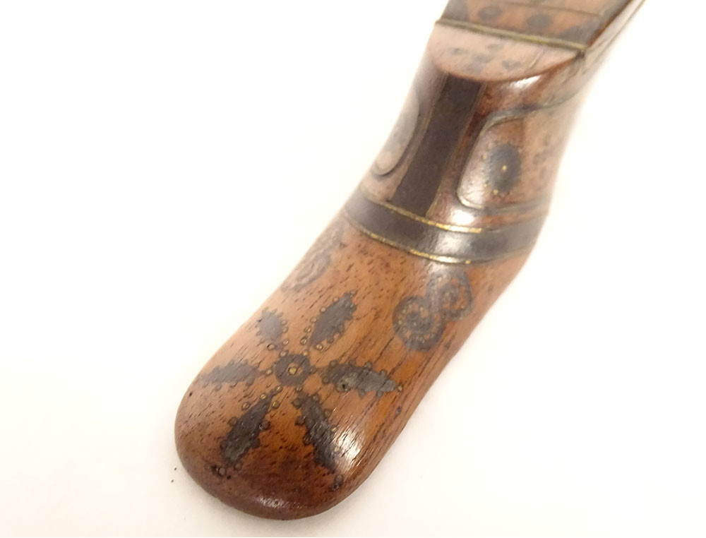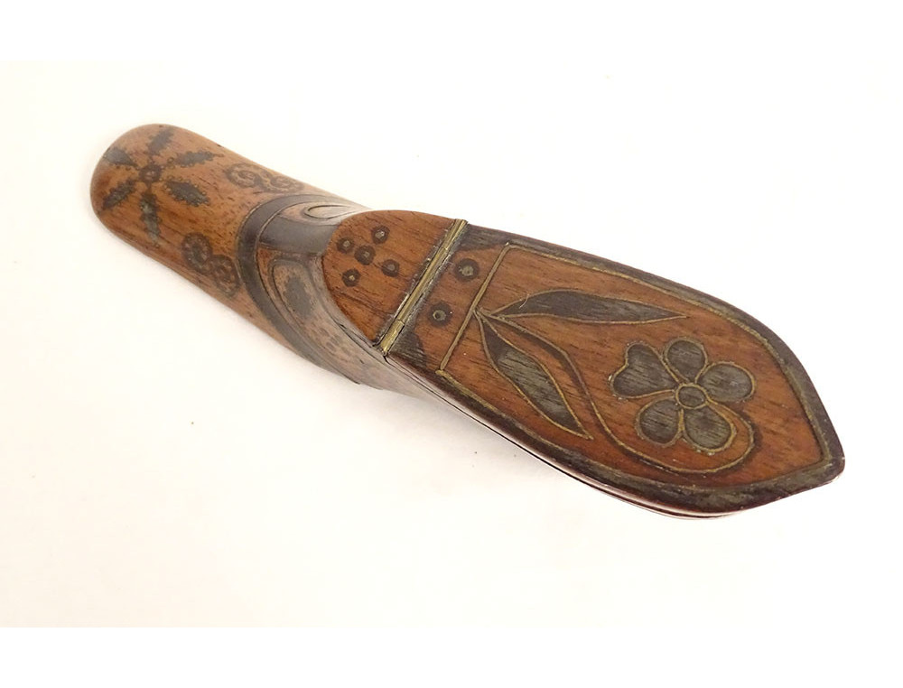 Carved wooden snuffbox, in the shape of a shoe, with marquetry decoration and brass inlays of nails and threads in the shape of stylized flowers, hinged lid, work of Folk Art, 19th century.