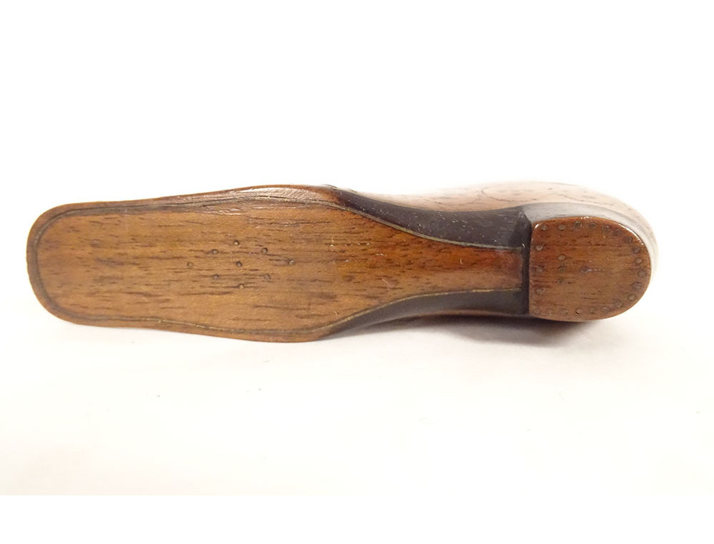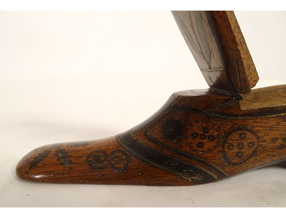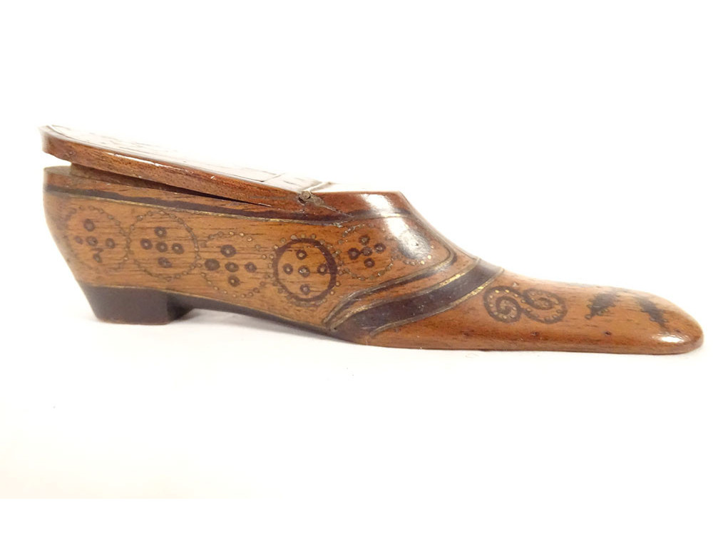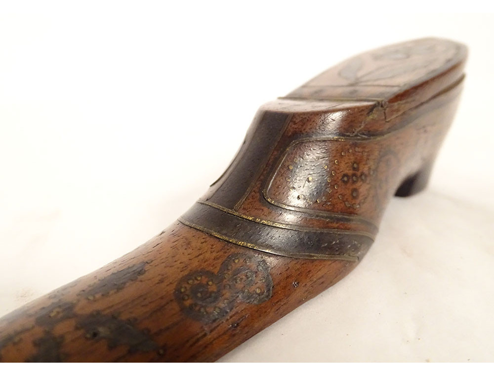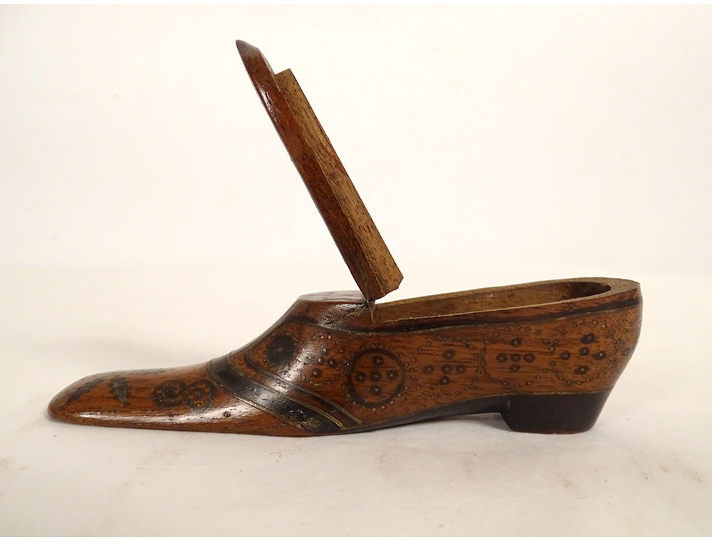 Snuffbox shoe carved wood marquetry brass nails Folk Art 19th