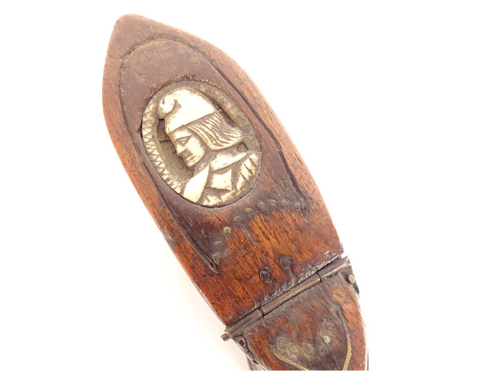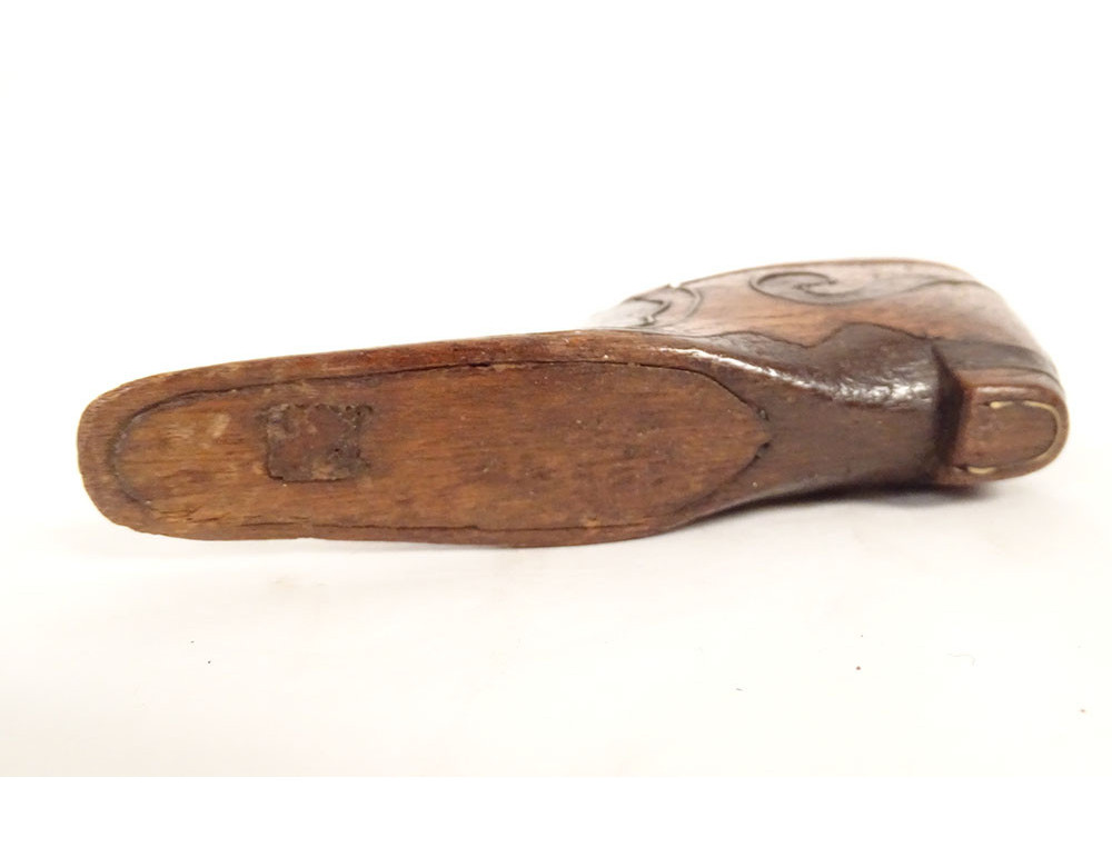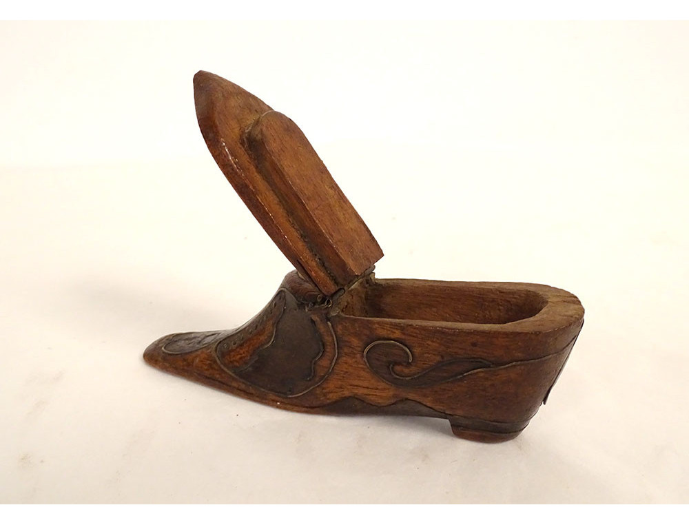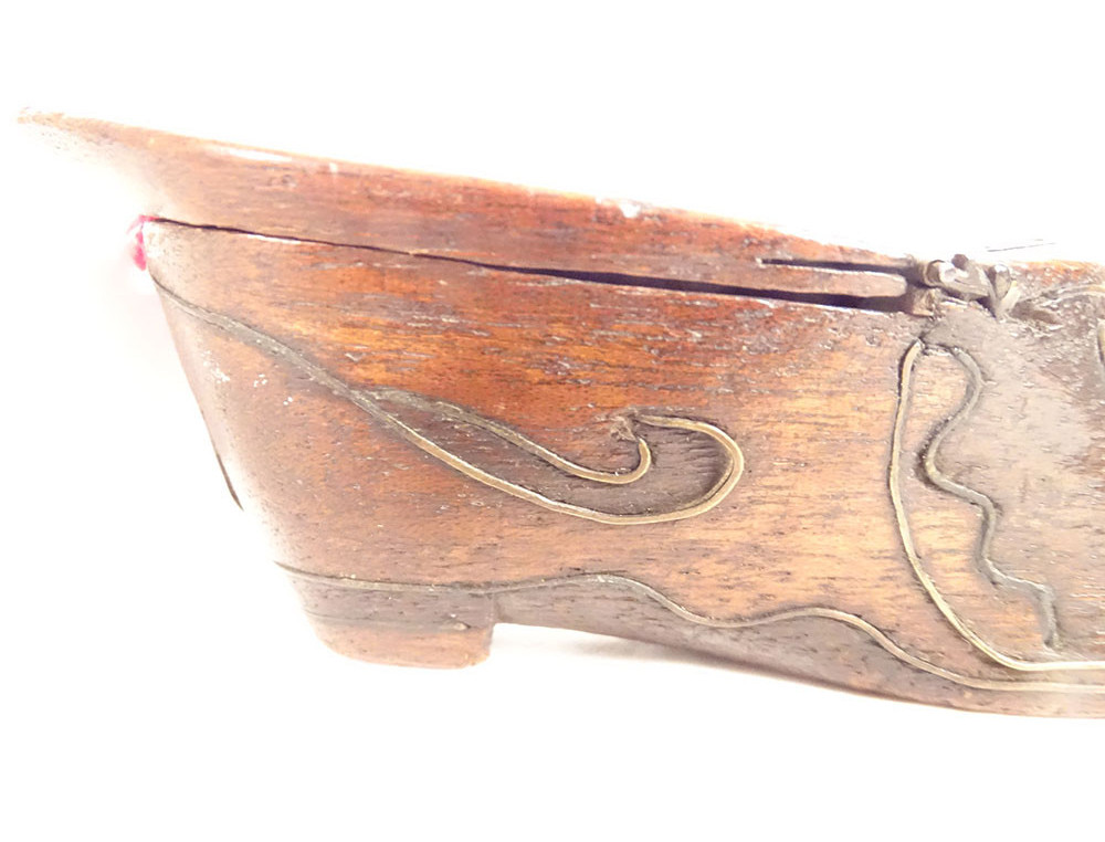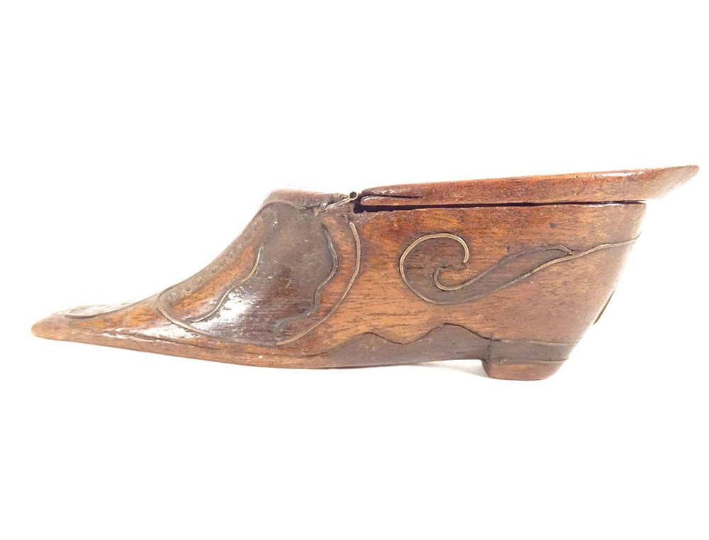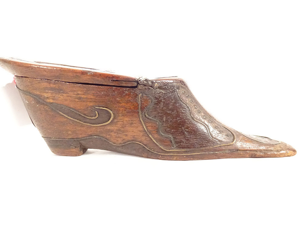 Carved wooden snuffbox, in the shape of a shoe, with marquetry decoration and brass inlays of nails and threads in the shape of stylized flowers, hinged lid, work of Folk Art, 19th century.