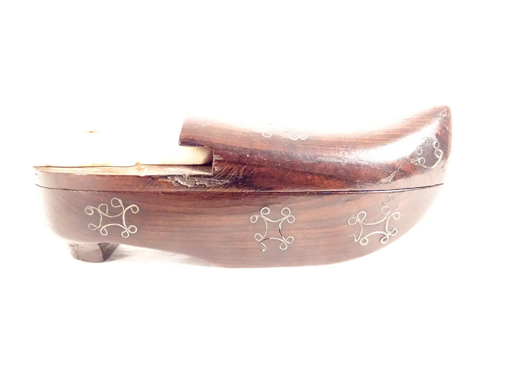 Snuffbox shoe carved wood marquetry brass nails Folk Art 19th