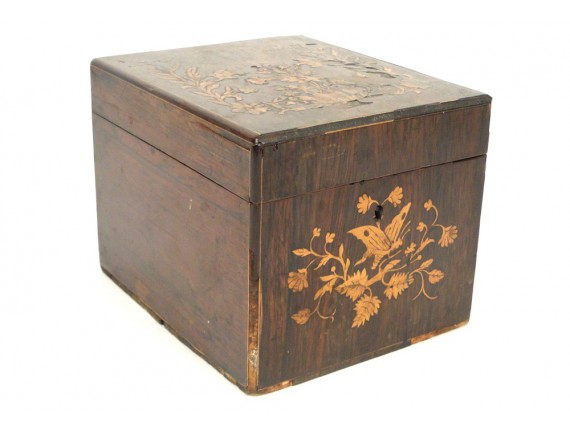 Pretty box or wooden box of rosewood, light lemon and nets, decorated with inlaid birds foraging with a cut flower and a butterfly, then Charles X nineteenth century.