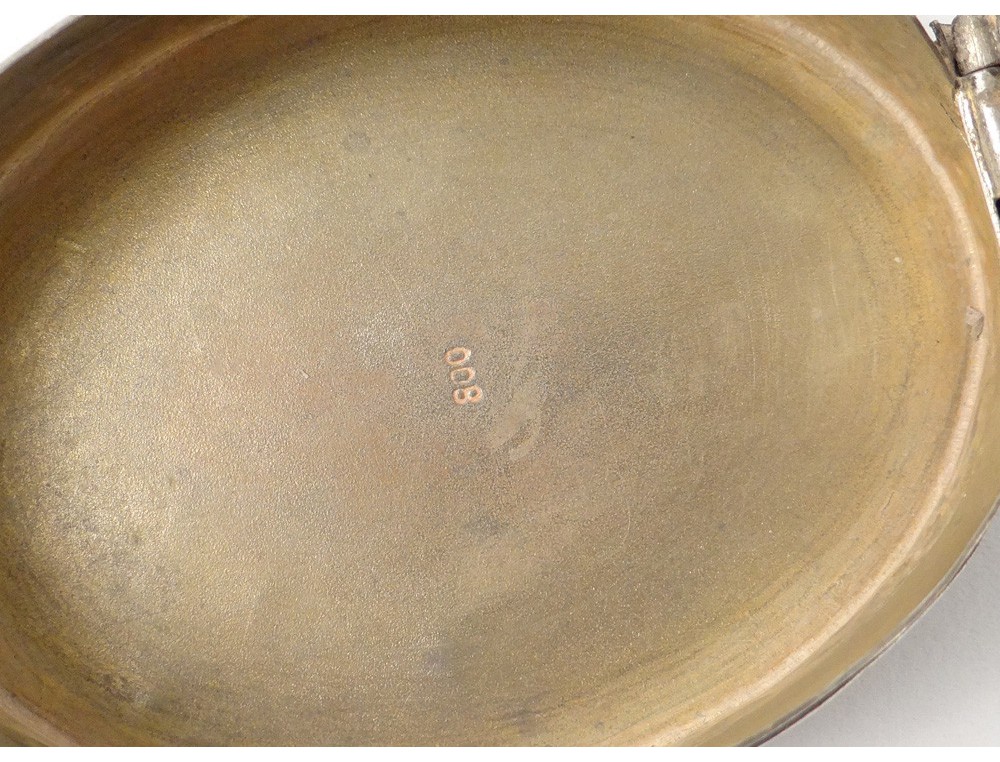 Very nice small oval box or compact solid silver certainly German, stamped 800, decorated with two cherubs at the edge of the water in front of a swan, vintage early twentieth century.