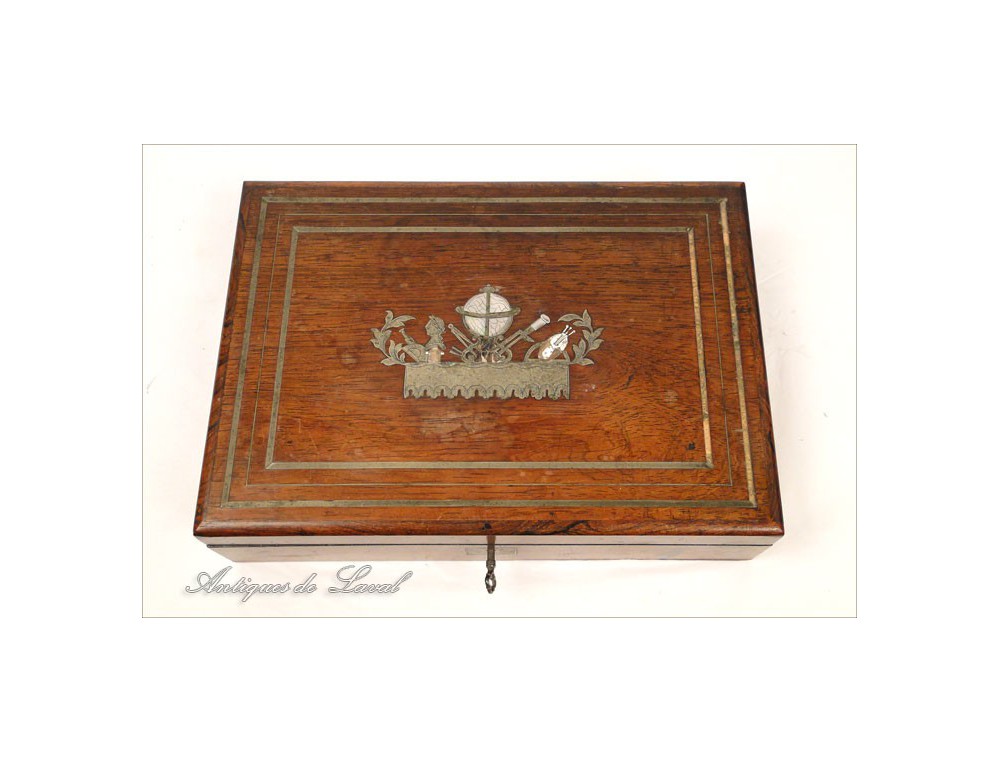 Compass in mahogany box, pearl and silver plated brass fillets, decorated with measuring instruments and Astronomy (compass, globe, rules ...) and a bust of Caesar, Napoleon III nineteenth century.