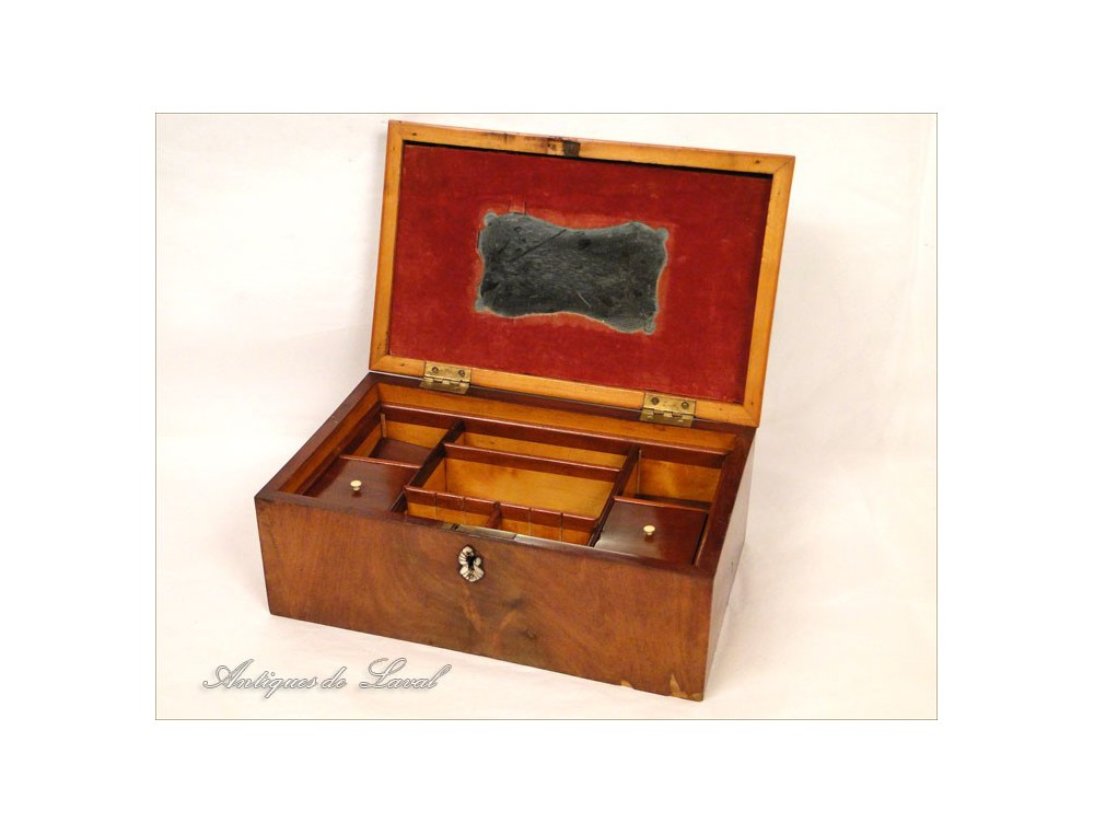 Box or sewing kit in English cherry and mahogany veneer, decorated with inlaid on the top, marked "Grinding," of XIXth century.