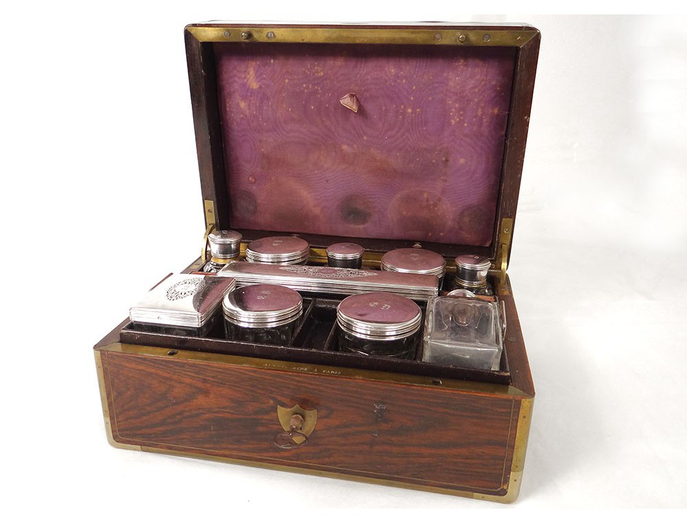 Travel box with sewing kit and toilet, mahogany and fillets of gilt brass, monogrammed on top, signed the toymaker master "Aucoc Elder in Paris" with its bottles and glass jars or glass and sterling silver setting ( Old man punched 1 title Paris, JC goldsmith punch with a heart and a star), XIXth century.