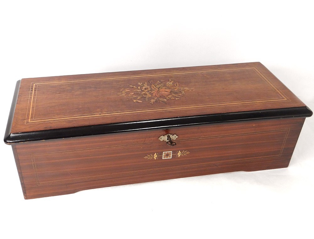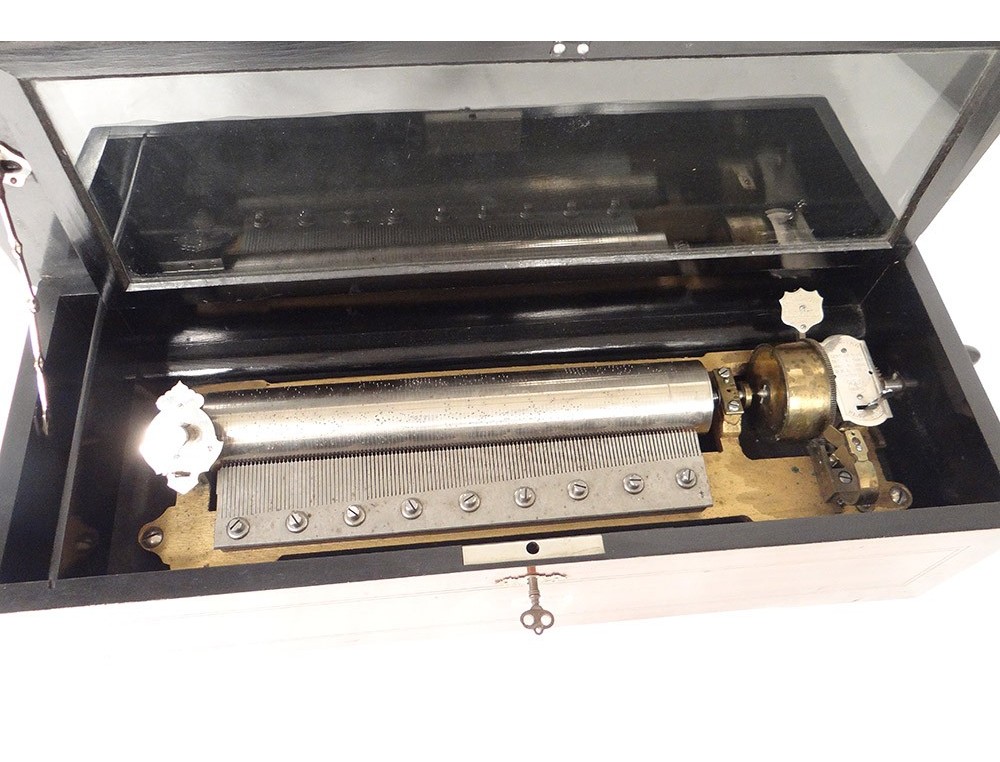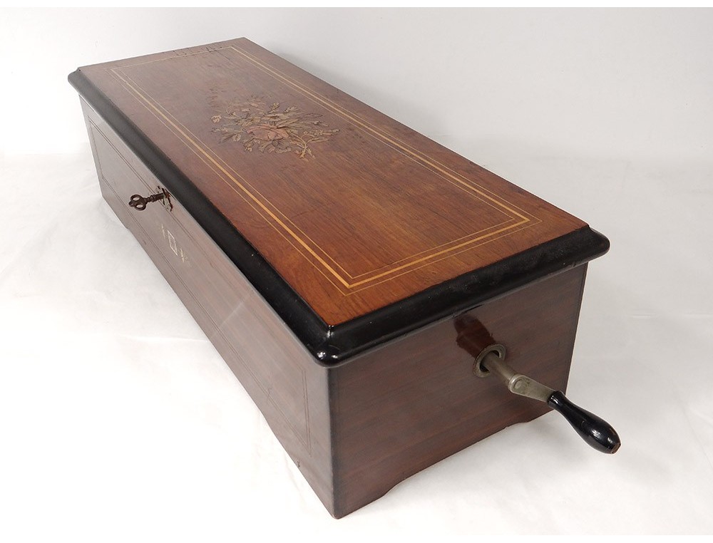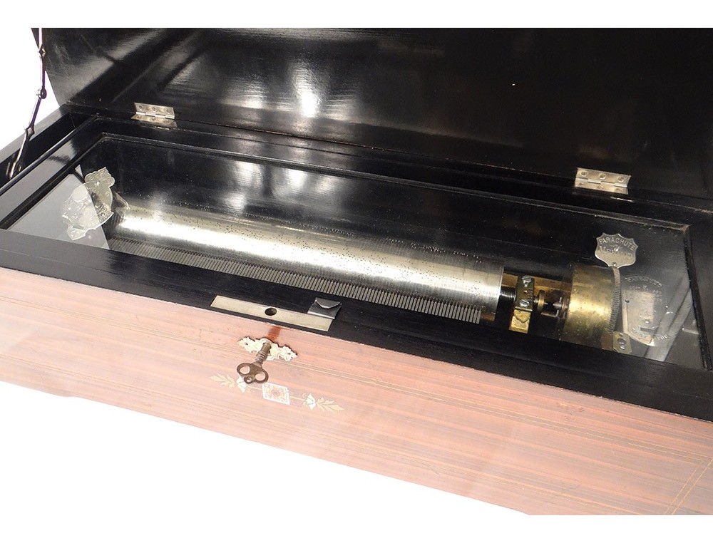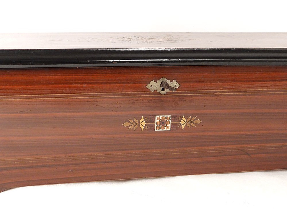 This box is in good condition and is of remarkable quality. The sound is particularly fine and powerful. We have the key, the lock works.