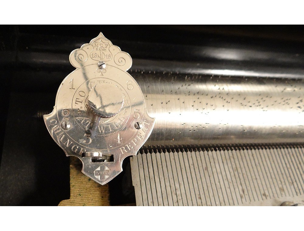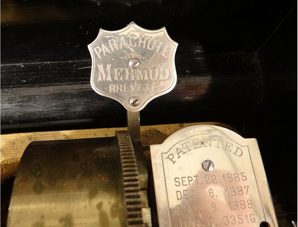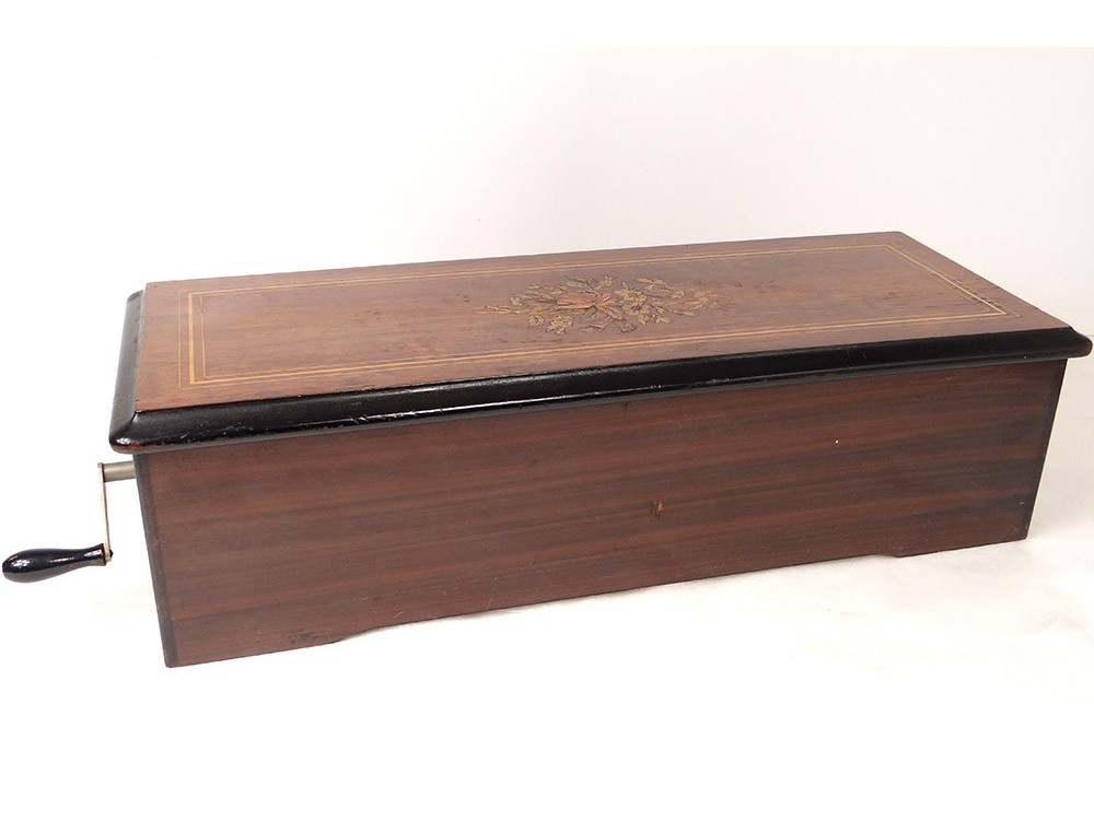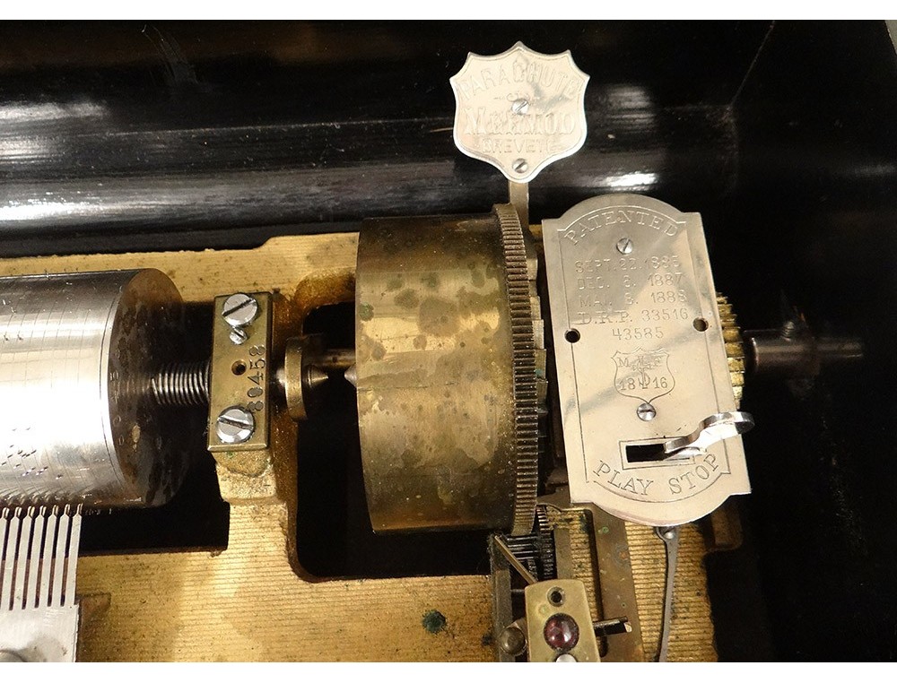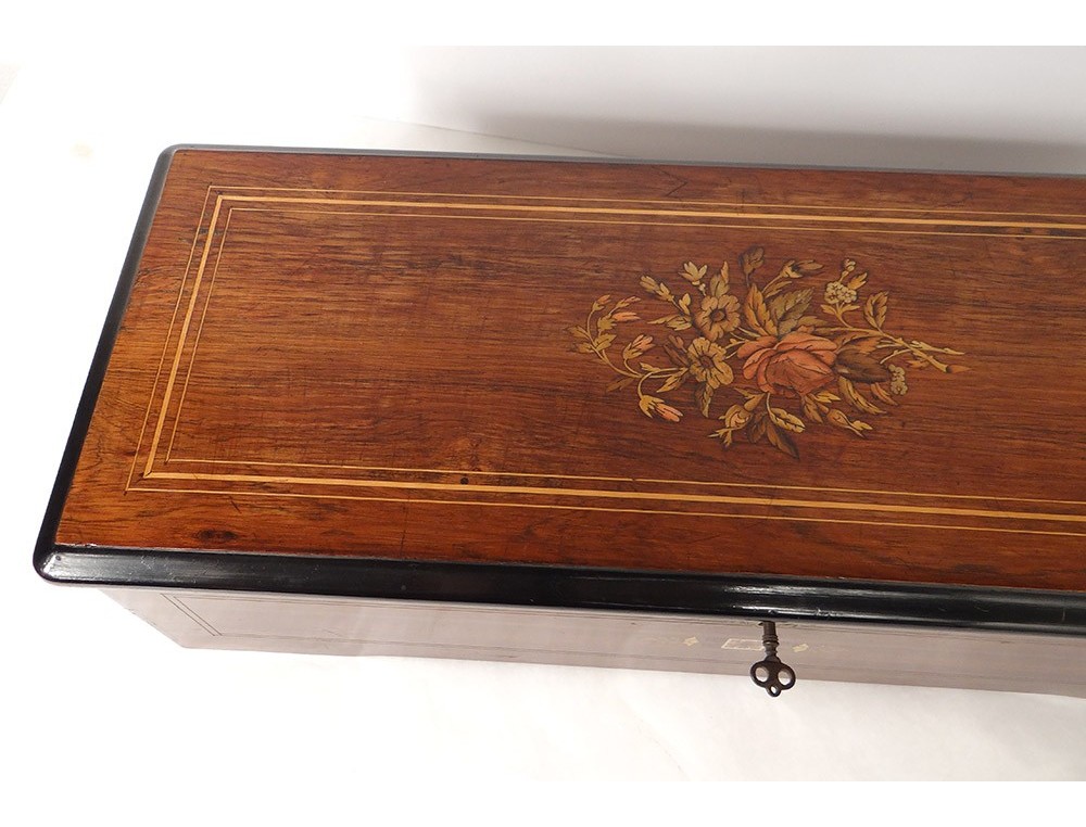 Grade music box or cartel, with parachute "Mermod", playing 6 tunes, painted wooden box and marquetry decorated with colored flowers, of late nineteenth century.