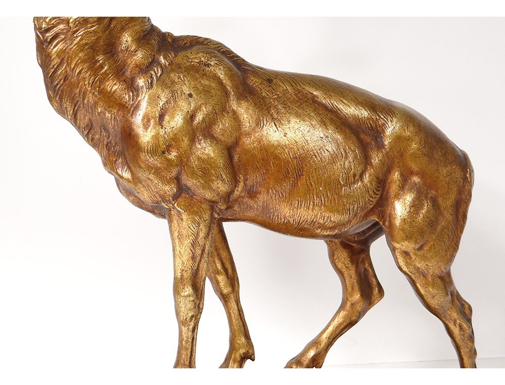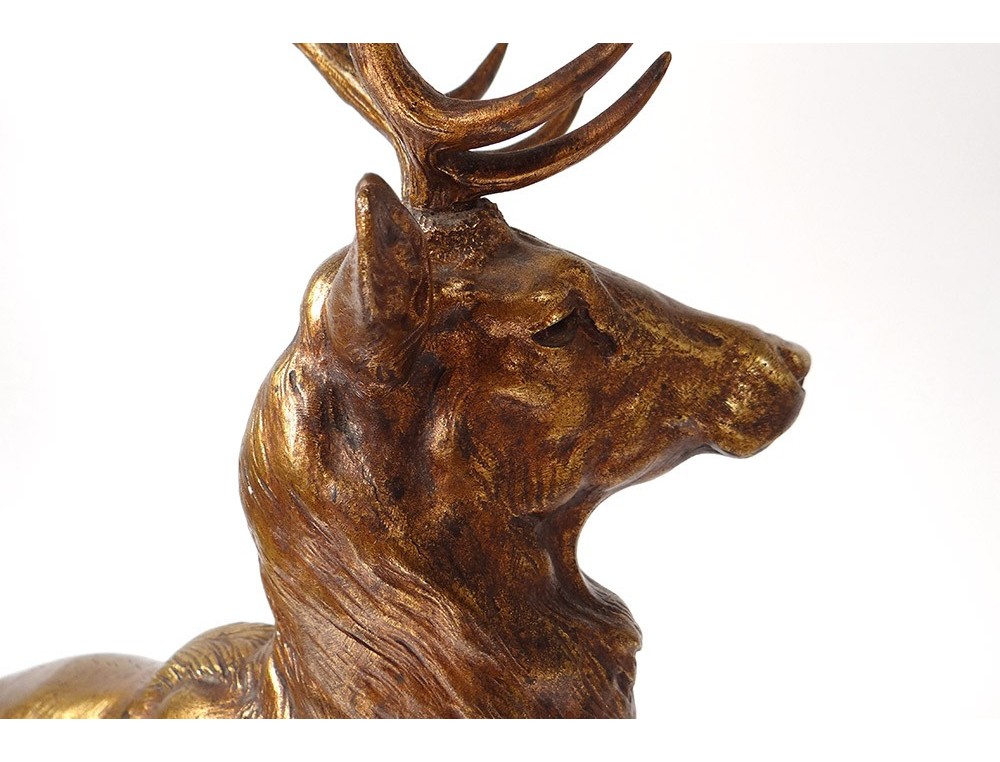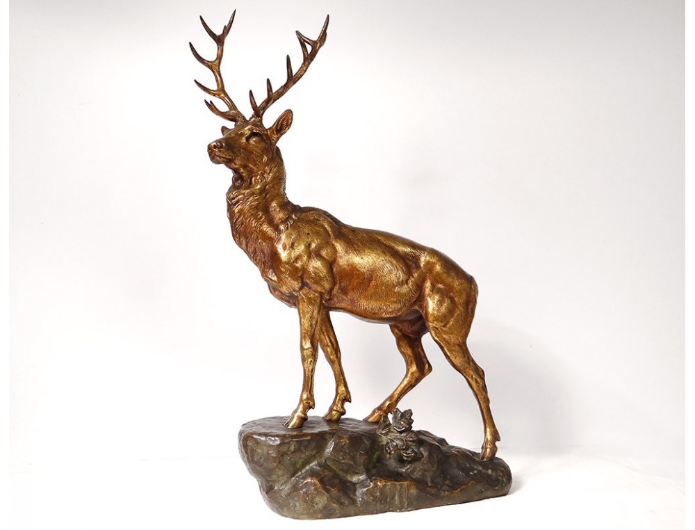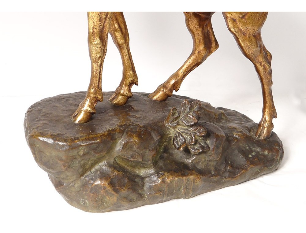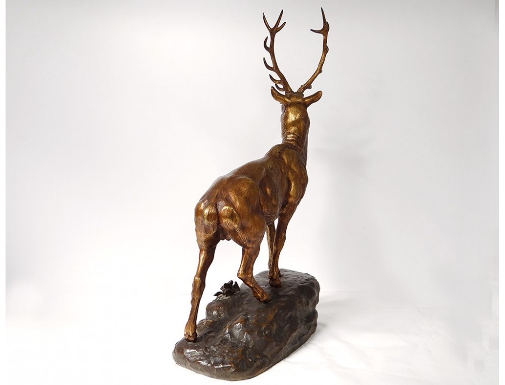 Bronze sculpture with two patinas (brown-green and gold) representing a large deer standing hard a rock, signed JE Masson, * and foundry stamp Company of the Bronzes of Paris **, vintage early twentieth century.