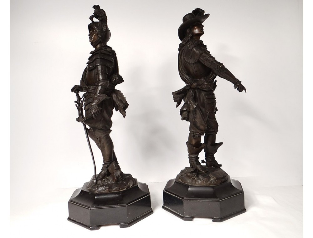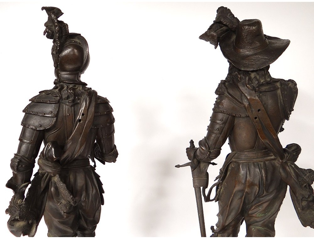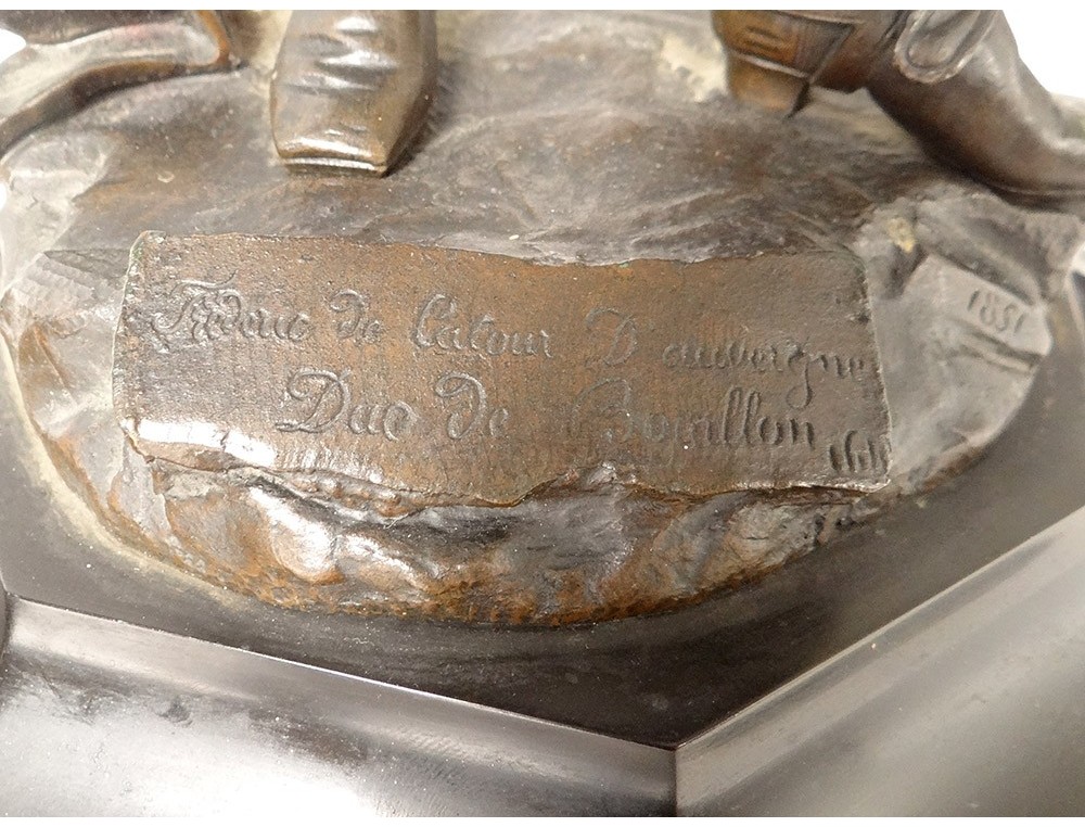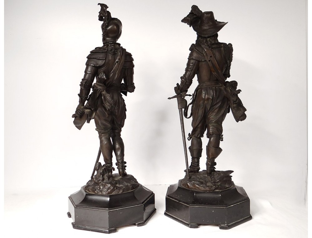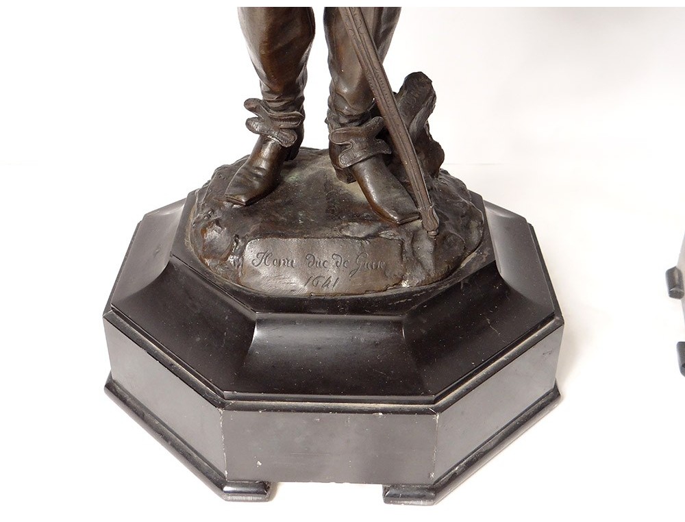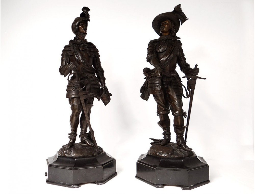 Pair of bronze sculptures signed E. Blavier * and representing Henry II Duc de Guise and the Duke of Bouillon Frederick of the Tower of Auvergne **, both in arms, during the Battle of Marfée *** in 1641 ( against the troops of Richelieu), black marble pedestals, dated 1851 of mid-nineteenth century.