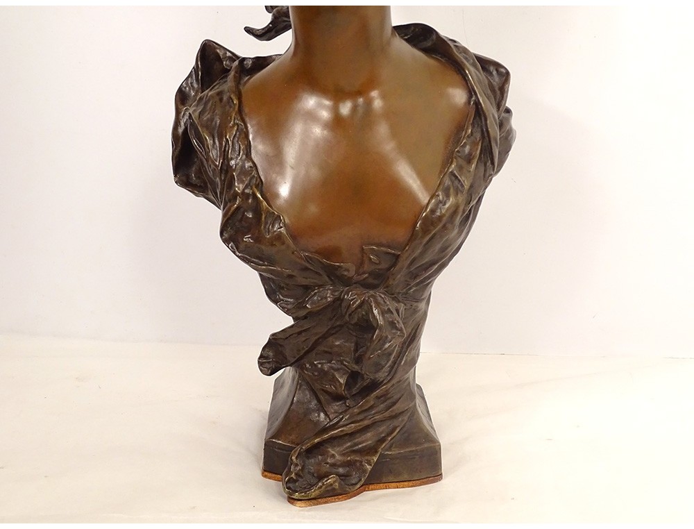 Brown patina bronze sculpture representing the bust of an elegant young girl with a hat, signed Hyp.Moreau*, Art Nouveau period late 19th-early 20th centuries.