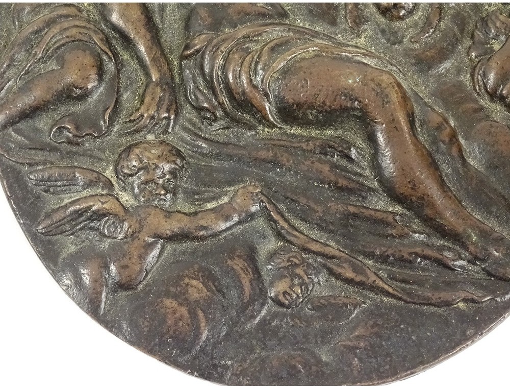 Small bronze bas-relief plaque representing the scene of the entombment of Christ, this one placed on his shroud and surrounded by many cherubs, from the end of the 18th century.