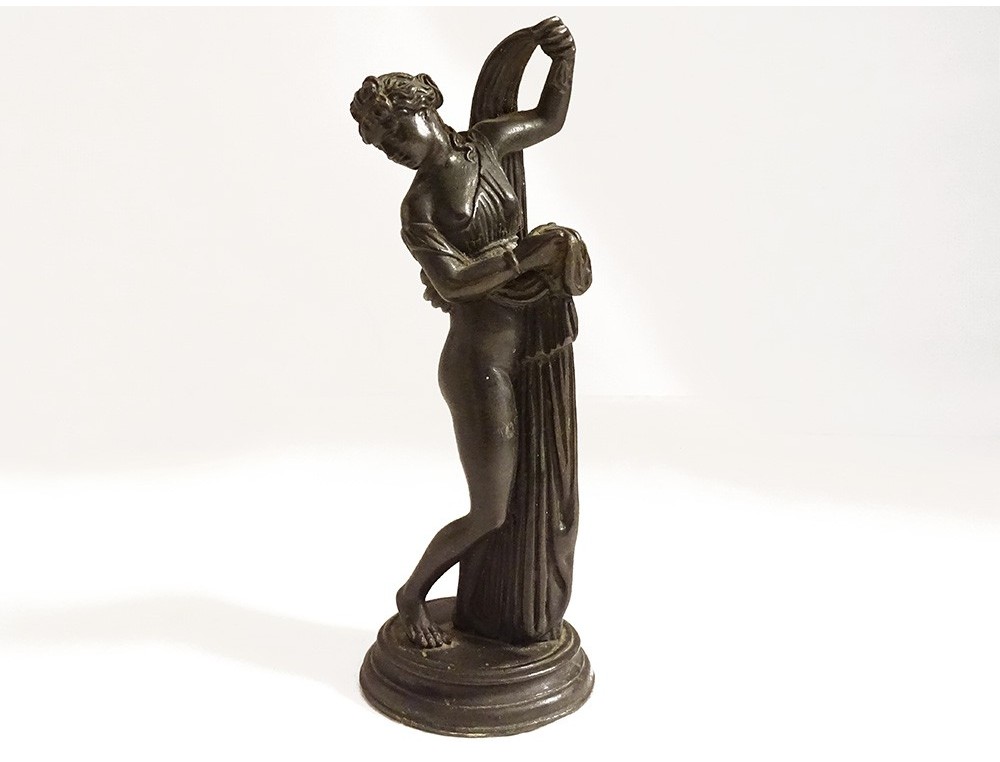 Bronze sculpture representing the goddess Venus Callipyge standing, turning around and holding the veil of Virtue, from the late 18th-early 19th century.
