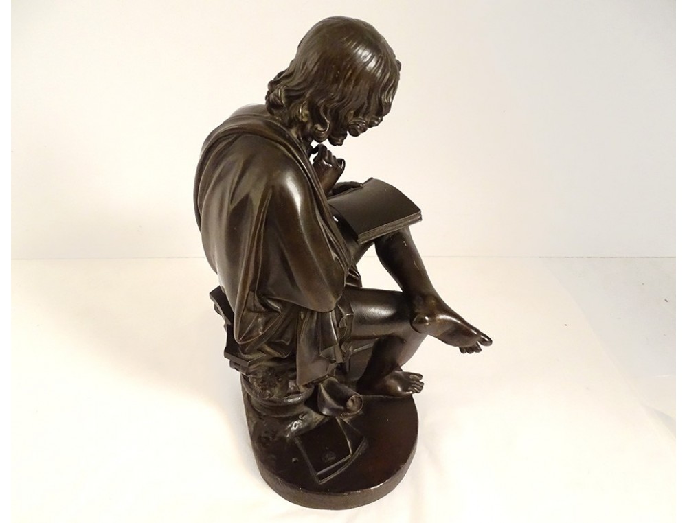 Bronze sculpture with brown patina representing a young man sitting on a Corinthian capital reading, draped in his clothing, at his feet are placed other sheets and parchments, as well as a square, compass and inkwell, Allegory of Knowledge (Arts and Sciences), from the 19th century.