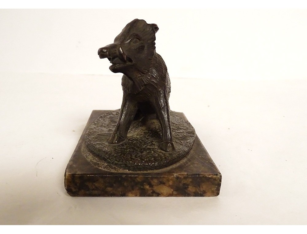 Small sculpture forming a finely chiseled bronze paperweight representing a seated boar, on a rectangular marble base, from the 19th century.