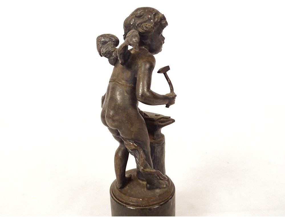 Small brown patina bronze sculpture representing a Love Blacksmith, holding a hammer and pincers in his hands, in front of his lock, on a round marble pedestal base, from the 19th century.