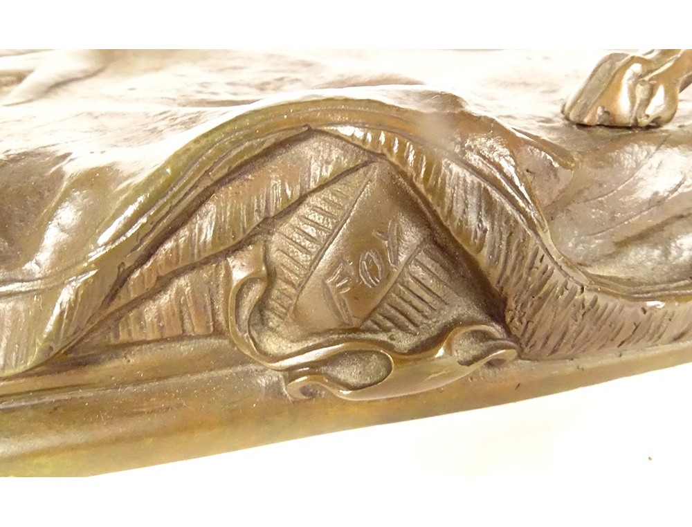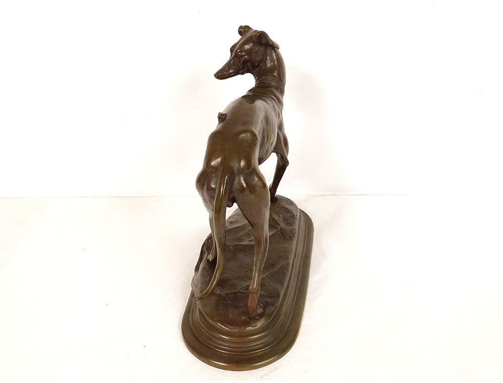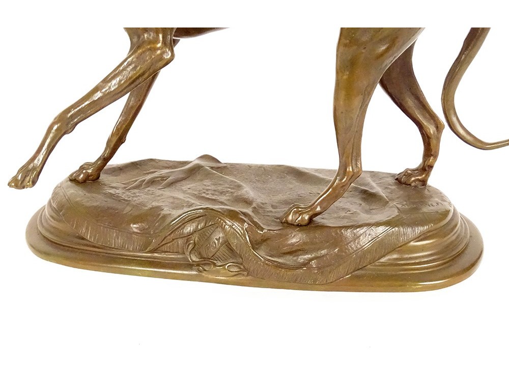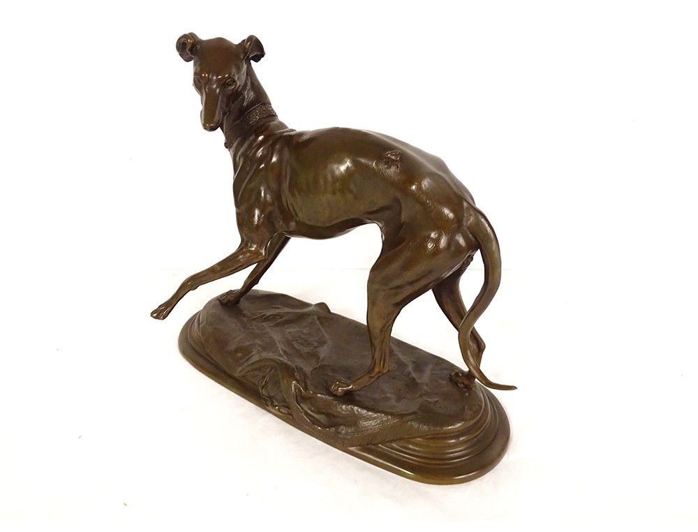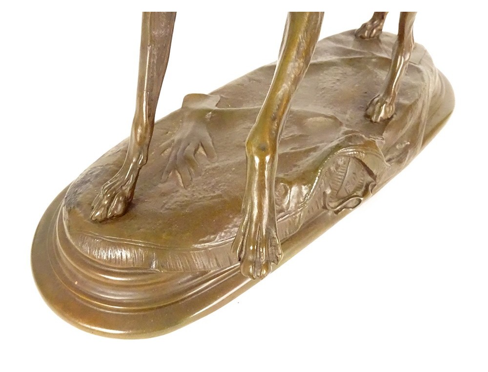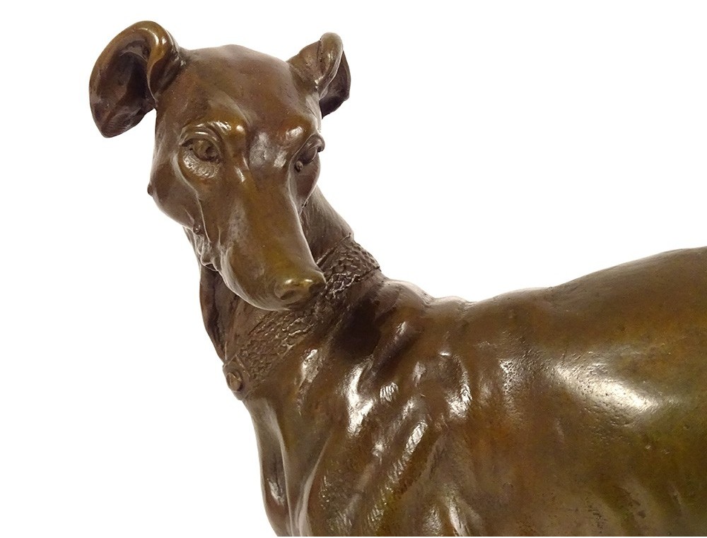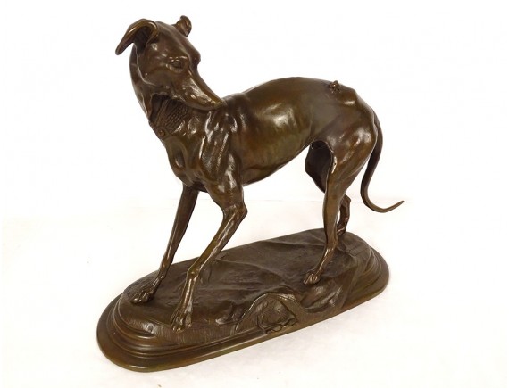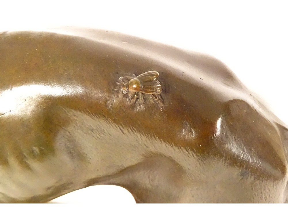 Bronze sculpture with brown-green patina "Greyhound with a Fly", representing a dog named Foy, signed Alfred Barye*, from the 19th century.