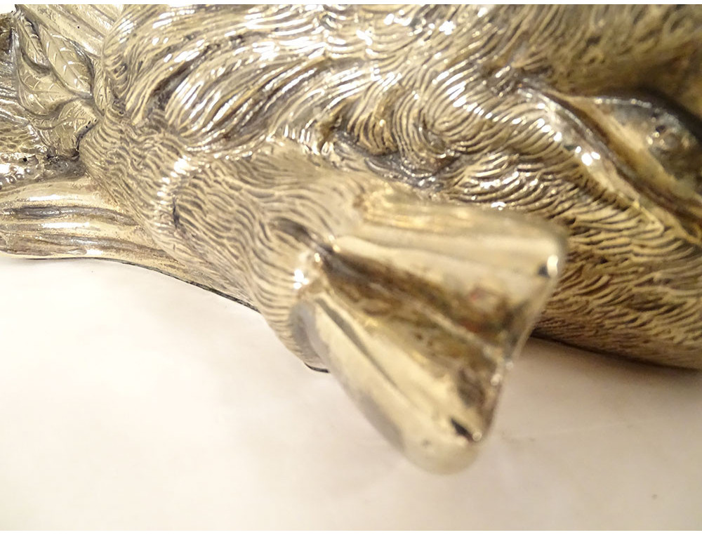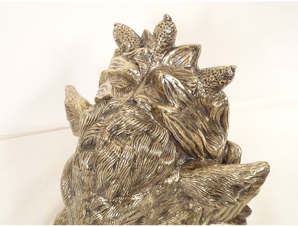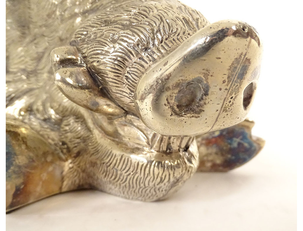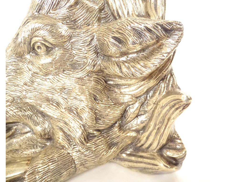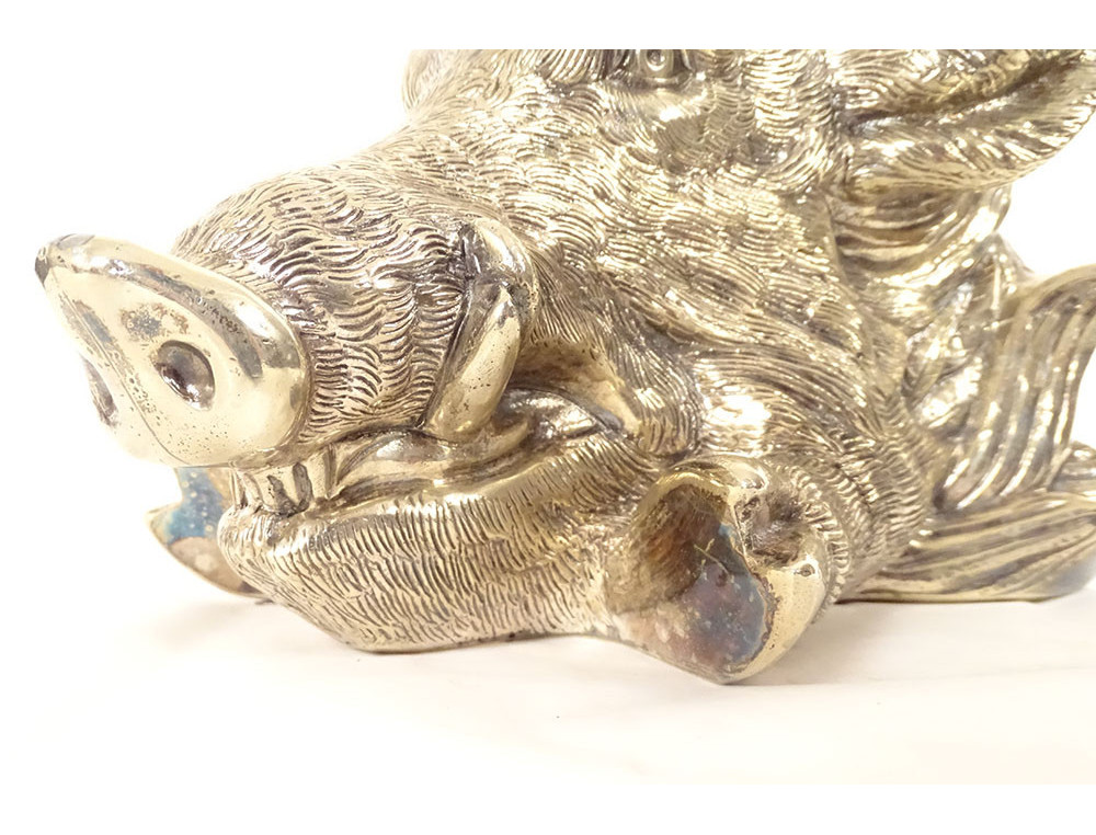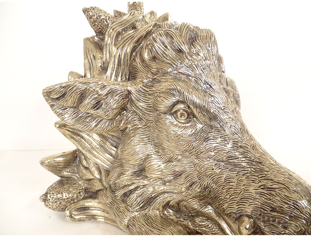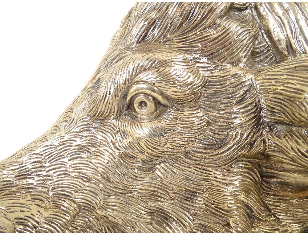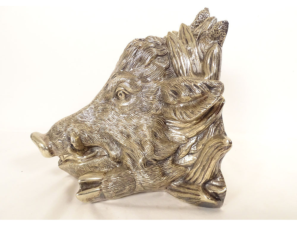 Finely chiseled silvered bronze sculpture representing a boar's head posed like a hunting trophy, dating from the early 20th century.